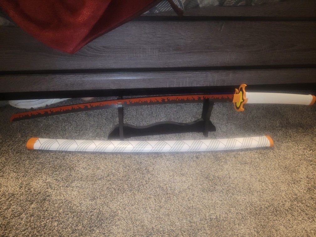 Rengoku sword that is dull (not sharp) that I brought a three years ago and have taken care of since then. I'm trying to sell for a new sword . I am willing to negotiate on the price! The sword stand comes along with the sword.