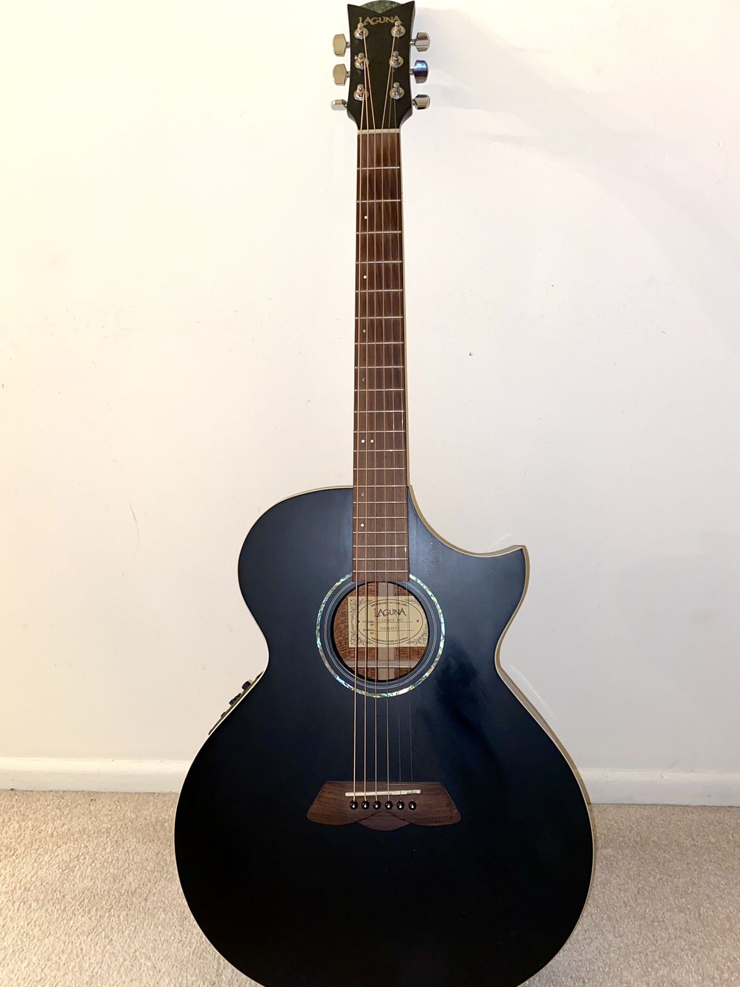 MSRP: $420 Laguna guitar with built in tuner (black with iridescent corners) Almost perfect condition with minimal scratches in the back (see pictures)