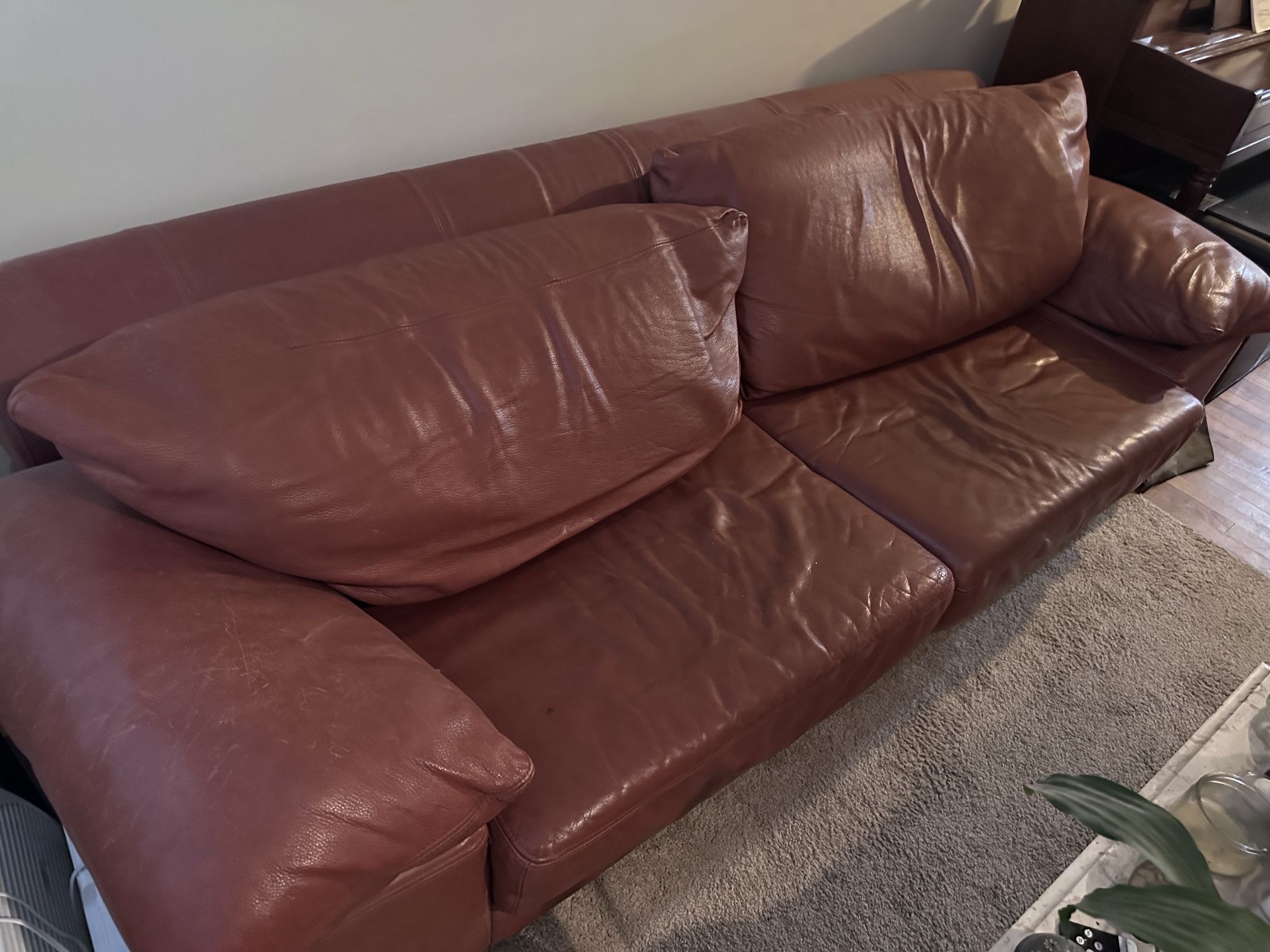 $450 OBO - NATUZZI LUXURY GENUINE ITALIAN LEATHER SOFA (86"L x 40"W x 17"H (seat) or 30"H (back)), Beautiful rust color, luxury grain and quality Natuzzi design and stitching , brand name comfort. YOU WILL BE HARD PRESSED TO FIND A TIMELESS, LUXURY CLASSIC IN THIS CONDITION AND PRICE. *** CASH ONLY, NO APPS & CASH N CARRY ONLY *** PICK UP ONLY - SOUTHSIDE AREA