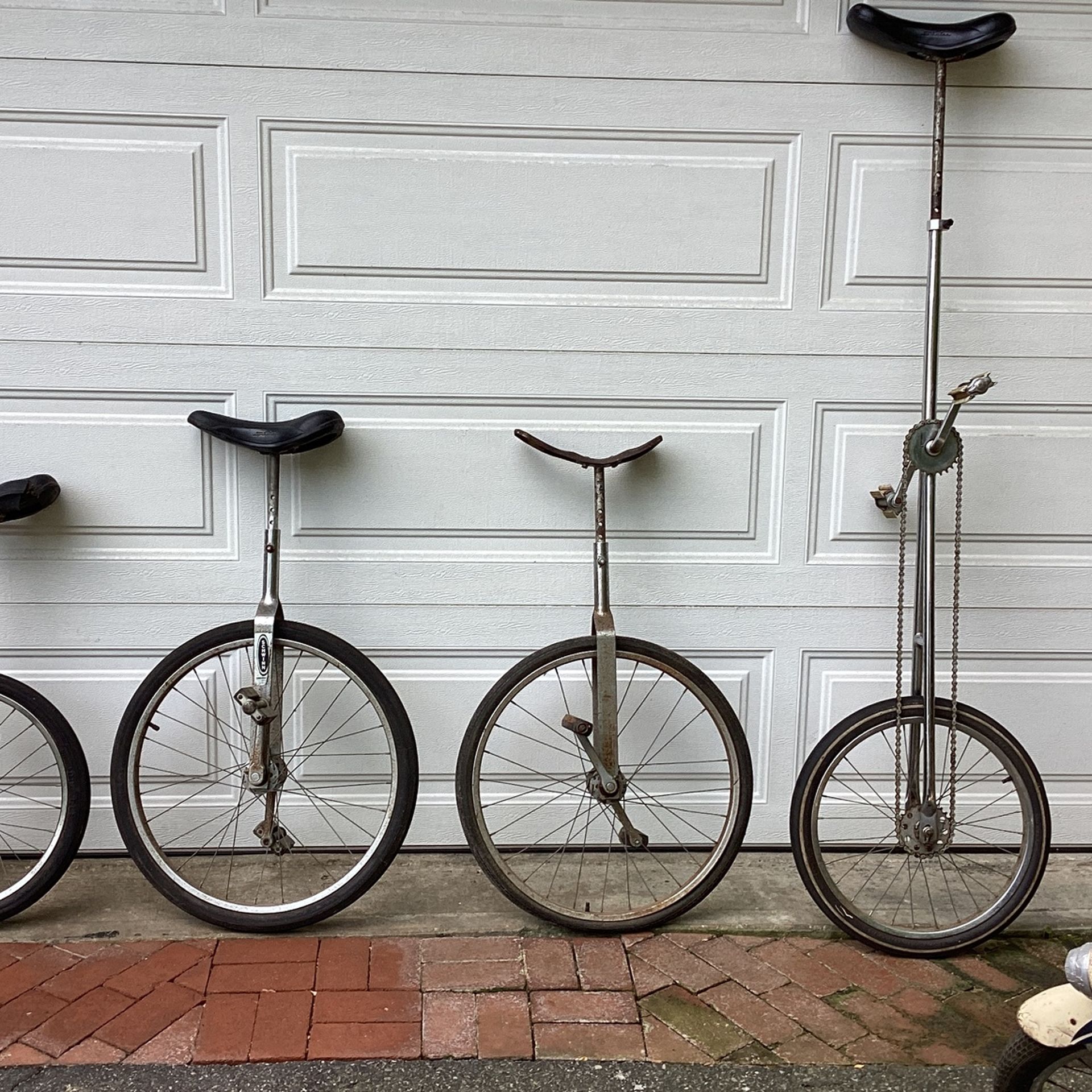 Selling all 4 of my unicycles all are original Schwinn bikes. The tall one is a six footer all 4 for $150 Bicycle man cave.