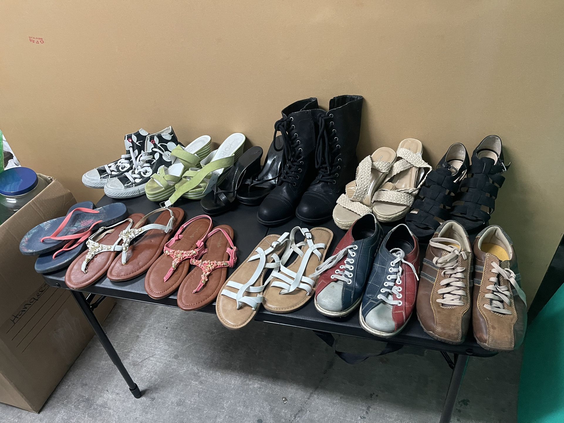 Pick up only - Buffalo and warm springs Name brands like Kors, H&M, Aldo, Charming Charlie, sketchers White and pink Charming Charlie shell sandles/ size 7-- $2 each White pair cross over sandles- size 8– $2 Flip flops- size 7 1/2–$2 Green Kors wedges /size 7 1/2– $5 Black Aldo wedge/ size 7– $5 Beige Charming Charlie wedge / size 8– $5 Black H&M wedge / size 7 1/2– $5 Blue and Red Dexter Bowling shoes/ size 8– $5 Brown Sketchers / size 8— $5 Black Faded Glory Boots/ size 8 1/2— $10 Converse size 7- $10