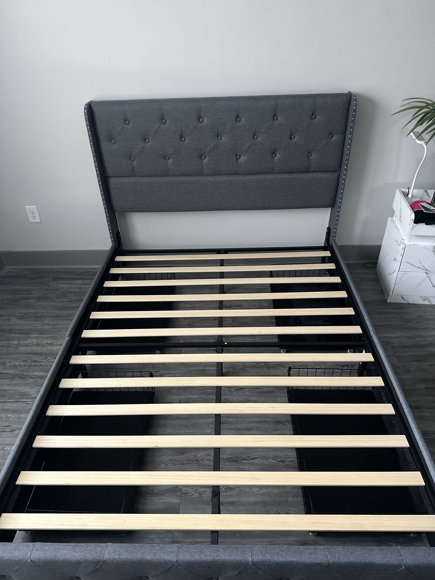 Open-box Queen Size Bed Frame w/ Storage Drawers and Tufted Headboard in GREY. Purchased from Walmart and before building I noticed one of the panels was MISSING the threaded insert (silver piece that allows you to screw the screw into the hole and have it stay). All other necessary pieces are included and unopened. The bed is GREY not white, the additional photos are from the website for measurements. Any questions lmk.