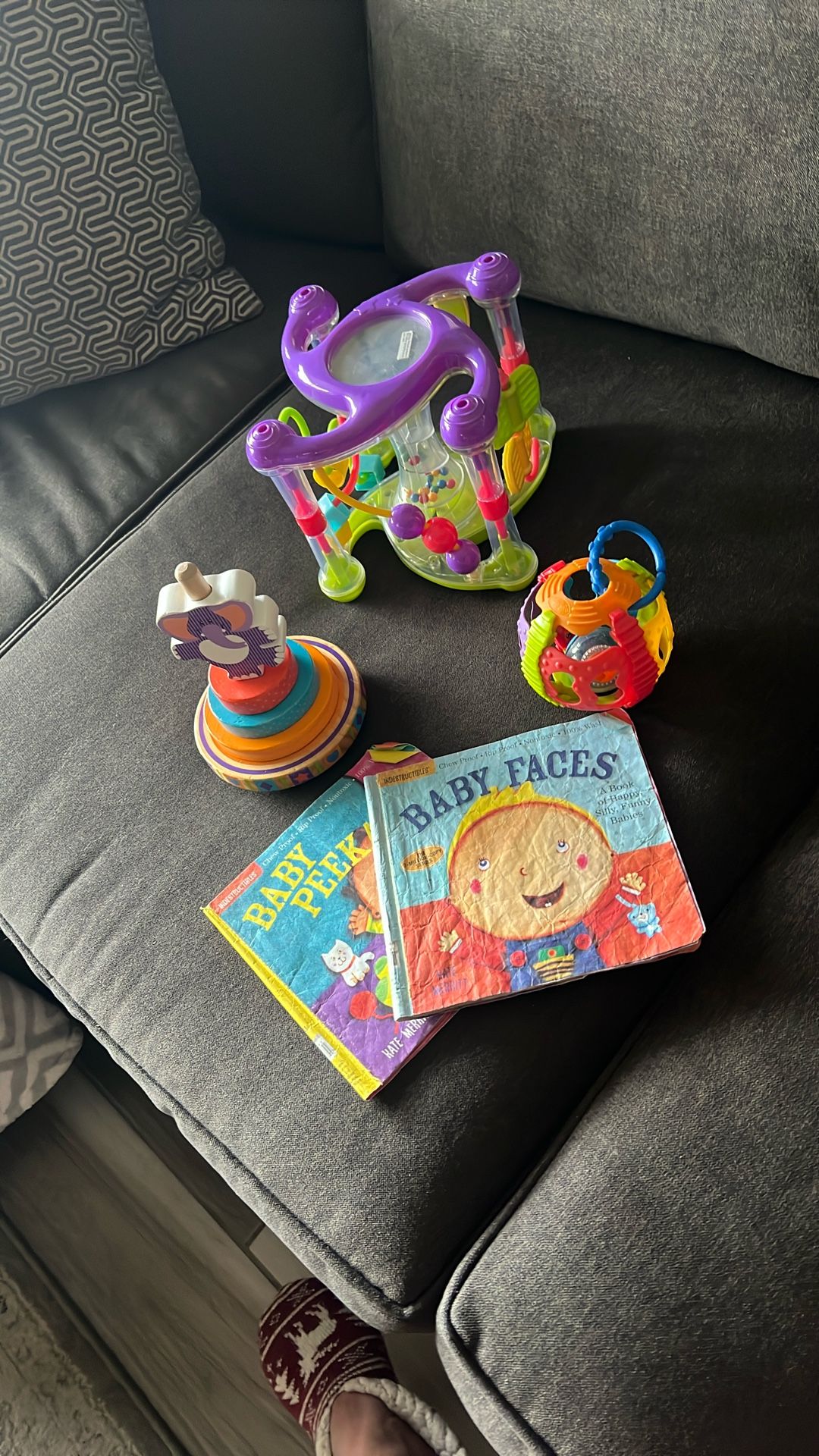 Wooden stacker, musical activity toy, shake rattle and 2 indestructible books. All for $20