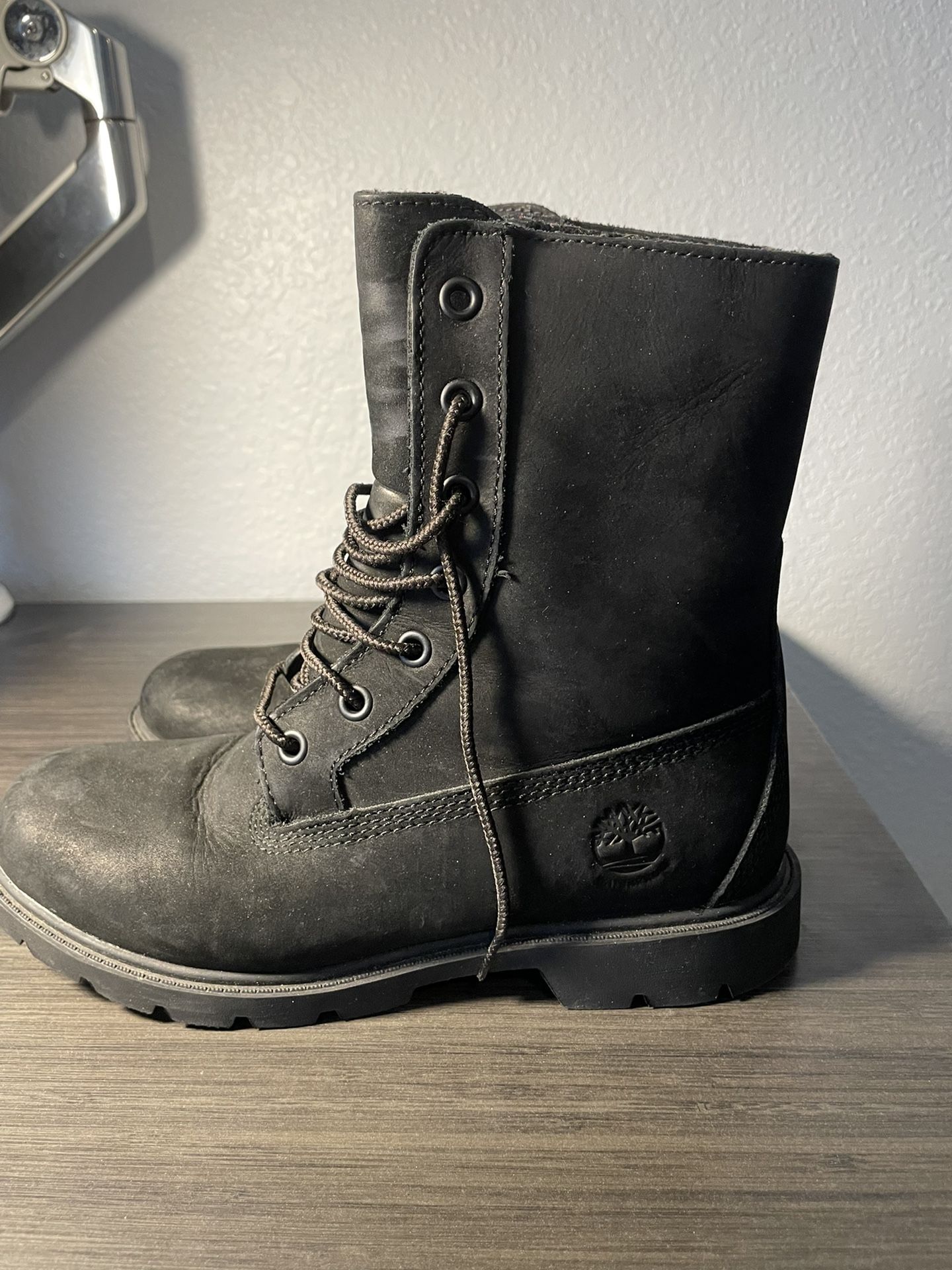 Timberland size 6 women. Black Used size 6 timbs- woman. Normal wear, no issues.