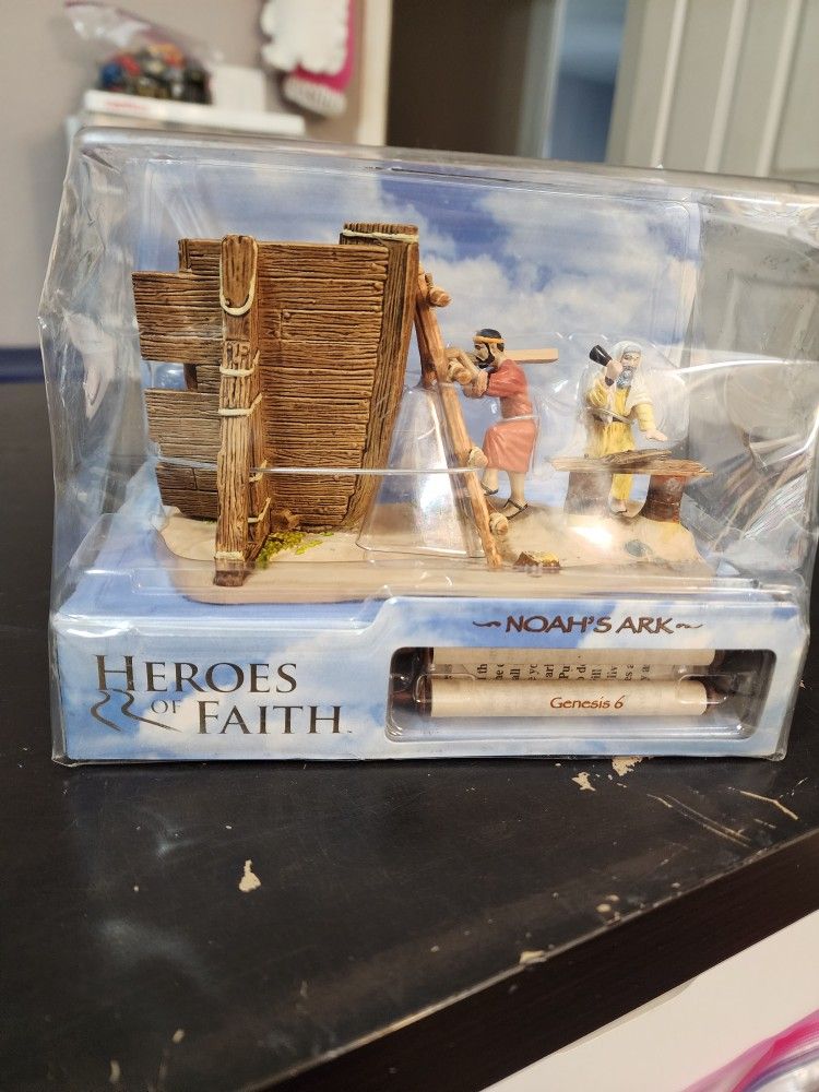 do not use cash apps I do not ship I do not meet you I no longer hold items Cross streets are Indian school and westwind parkway or 107ave westwind parkway in Avondale Subdivision is across from westview high school This is a Heroes of Faith Noah's Ark religious figure set. It is part of "Collection One" of the series. The set includes figures of Noah and a son, a table, and an Ark piece. These are detailed figures made of plastic rubber. Never opened
