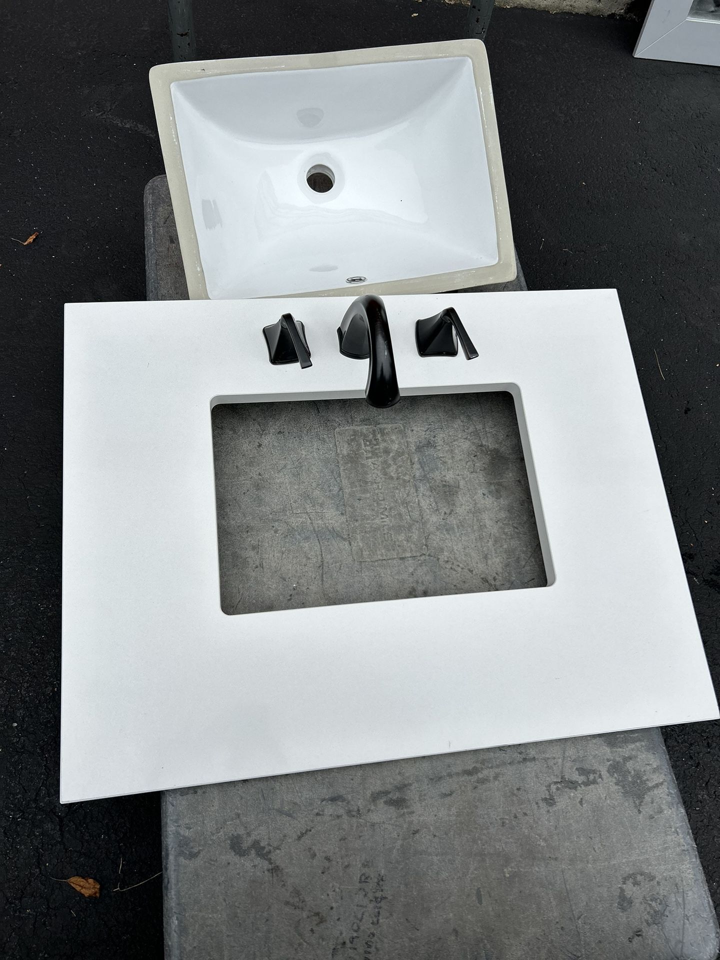 Never used brand new out the box White marble Heavy 25 inch I THINK IM NOT 100% SURE WILLING TO MEASURE FOR YOU UPON DELIVERY!! Black faucet comes with it fully intact needs to be screwed on . Black Stopper included .