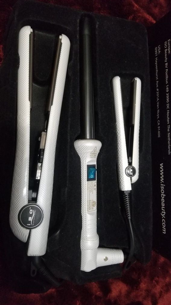 Iso Pro Full set Tourmaline Titanium Ceramic Set of 3 Straightener, Hair Curler, Mini straightener. Brand New. From 'Sally's' Retail $350. Selling set for $150 or Best offer. **can sell separately **