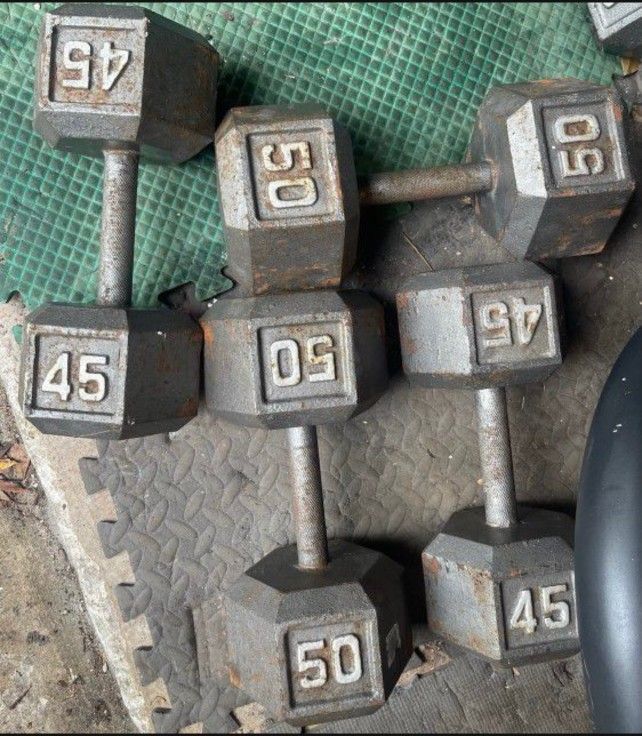 PAIRS OF 45s & 50s DUMBBELL EXERCISE WEIGHTS (will sell separately)