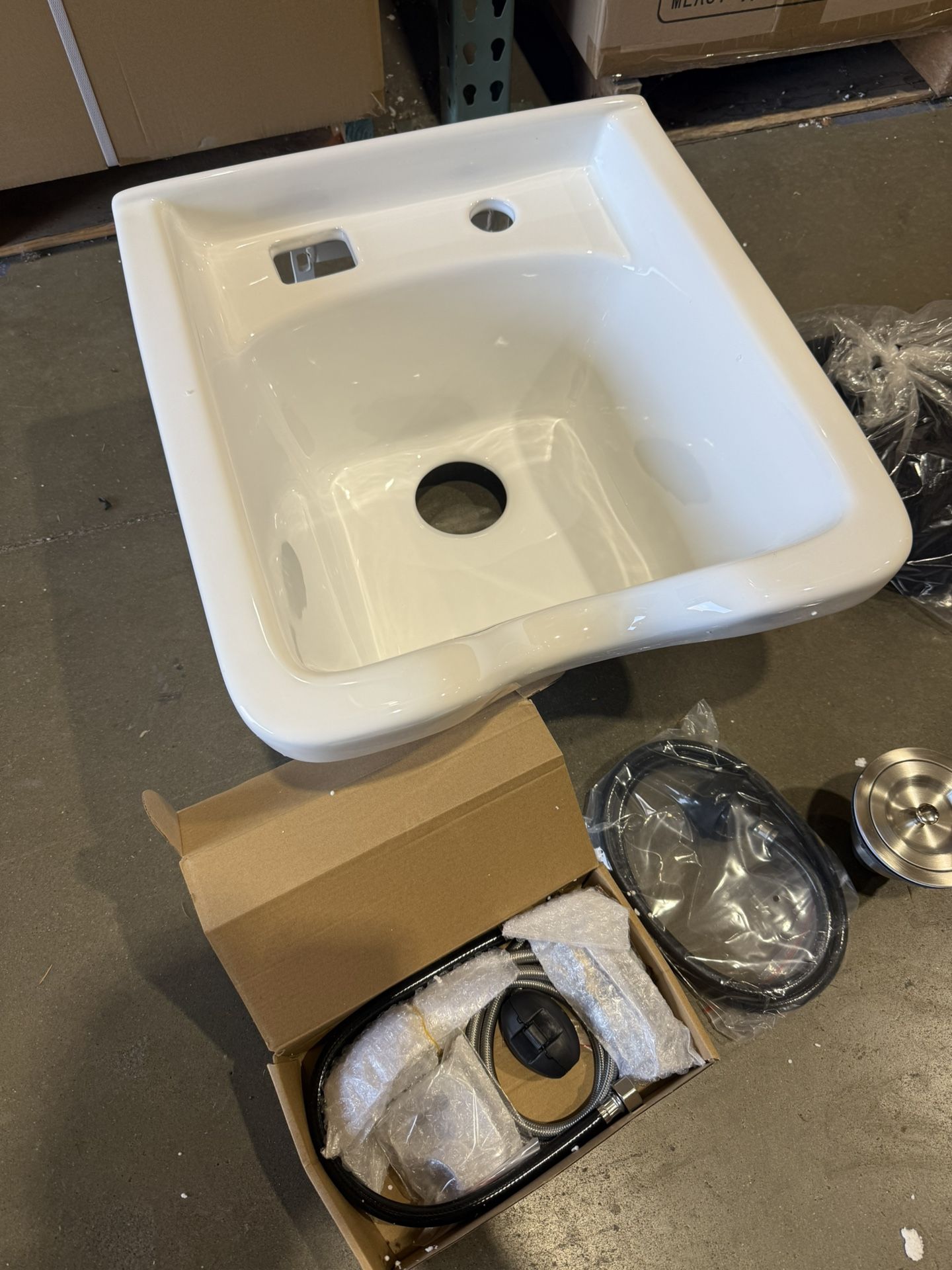 Brand new. Never used wall mount shampoo bowl. Mounting bracket/ Water connections/ drain connections included. 2 available. Bowl Dimensions 19”x20”x10 1/4”