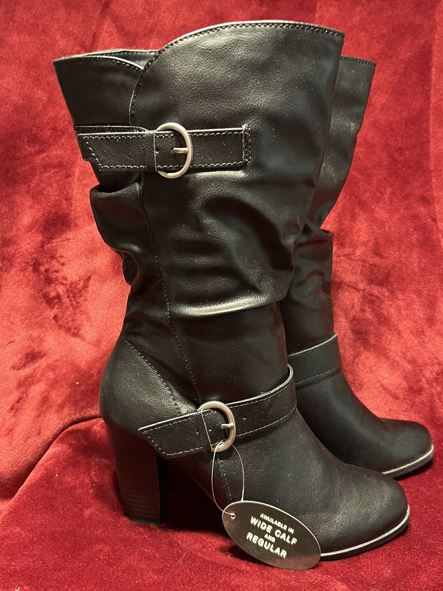 Black Leather High Heel Boots With Buckle Strap Size: 7.5 *NEW WITH TAGS*