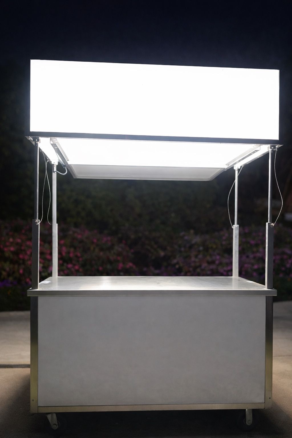 Can be wrapped ext Commercial Lighted Concession Cart – Marquee Light – NSF Listed Professional C. Nelson Mfg. Co. Model NJJ-326 commercial food service cart in good working condition. • NSF & UL Listed • Stainless steel construction • Bright marquee light display canopy • 115V power (2 separate 15A circuits) • Heavy-duty casters for easy mobility • Solid commercial-grade build The marquee light is bright and eye-catching — great for drawing attention. Everything powers on and works properly. This is a real commercial unit, not a lightweight retail cart. Clean, sturdy.
