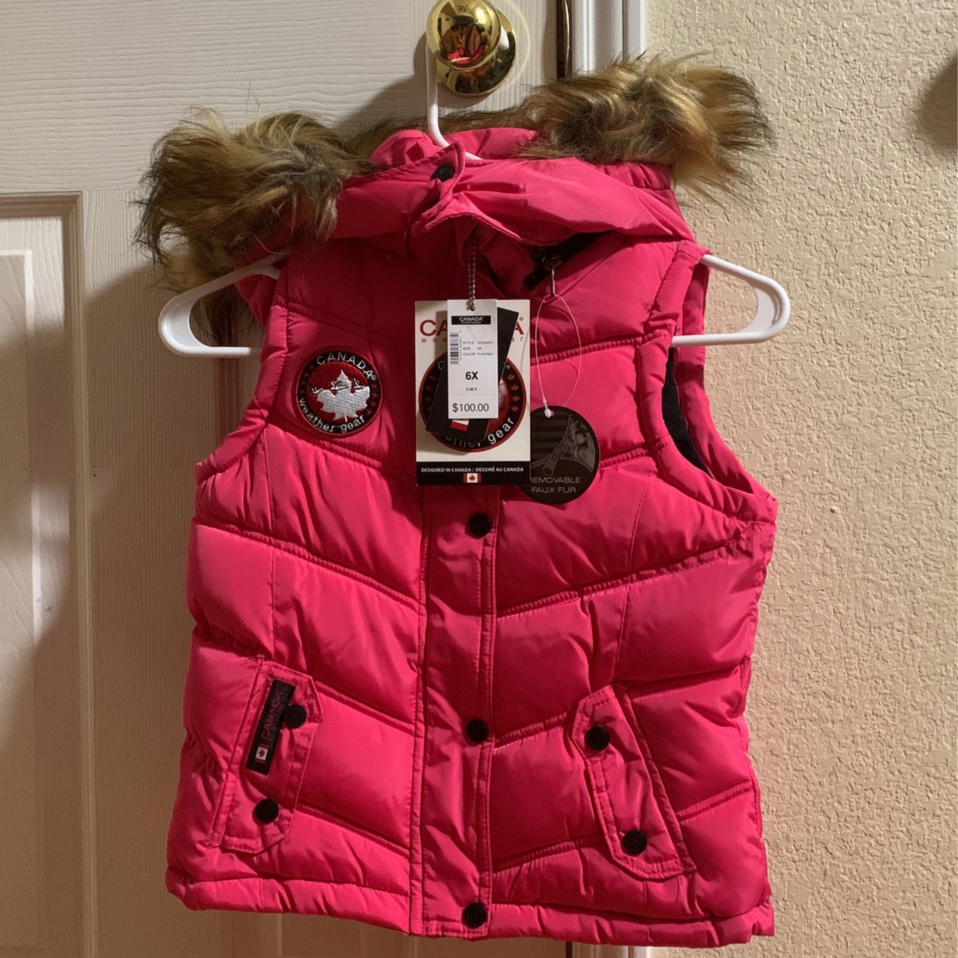 For girls, pink colored coat, never wore, brand is: Canada Weather-gear, regular size, size 6X