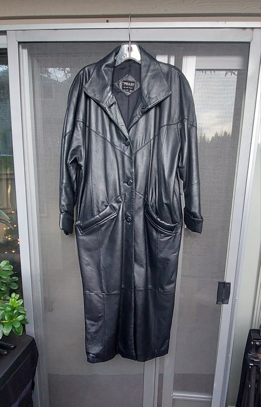 Great fashionable full Length black Leather Coat. In great clean wearable condition except it has a small tear just at the left pocket not very visible can easy be repaired (see picture). 4 Button closure. 2 front pockets cuffed sleeves. Measurements: Chest 21" - shoulder to shoulder 27" - length 46".