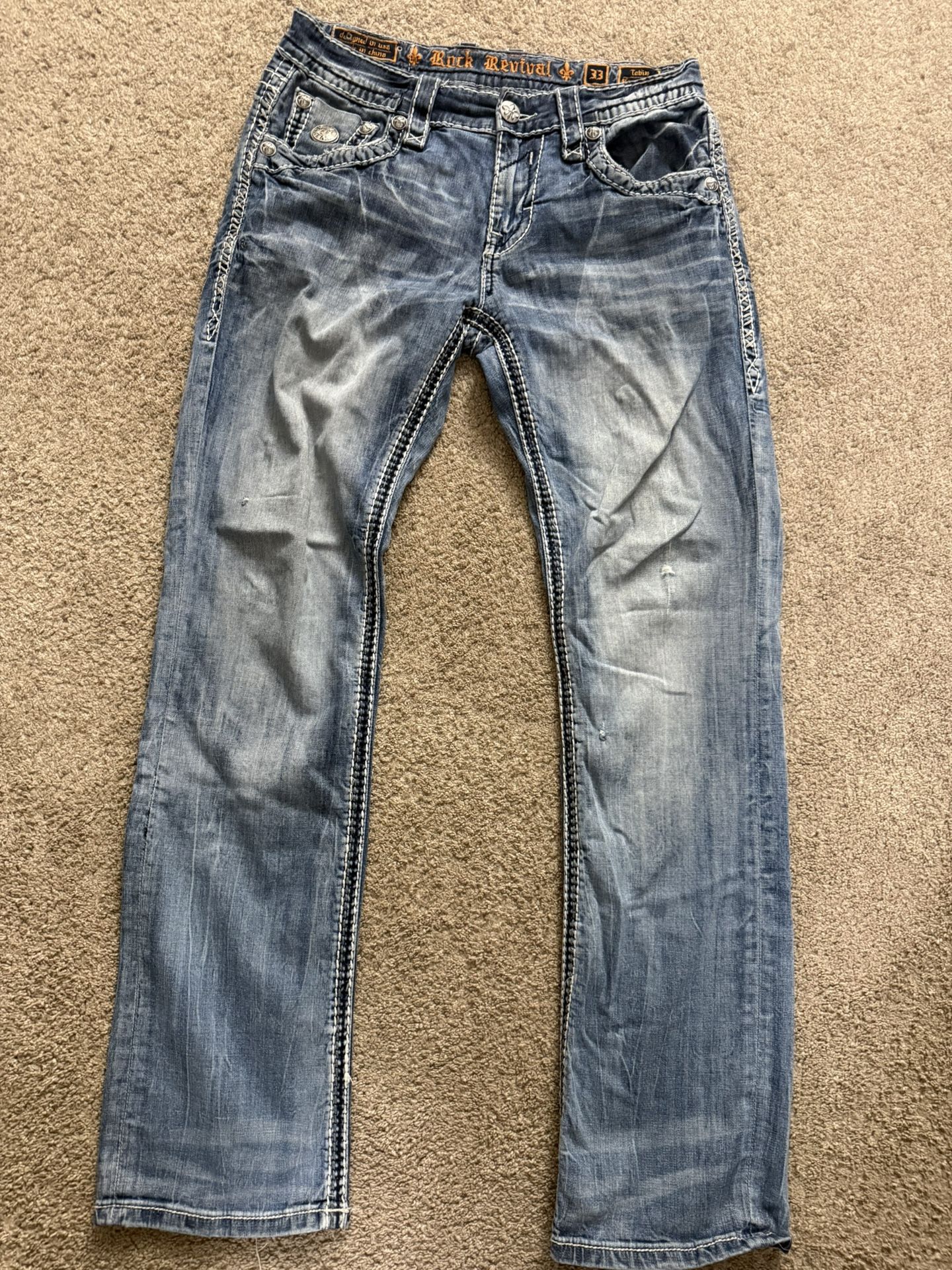 Vintage style Rock Revival Tobin Straight jeans featuring signature heavy stitching and embroidered back pockets. Condition: pre-owned with normal wear and fading from use. No major damage observed. Details: • Size 33 • Straight fit • Embroidered back pockets • Heavy contrast stitching • 98% cotton / 2% elastane stretch denim Please see photos for measurements and condition.