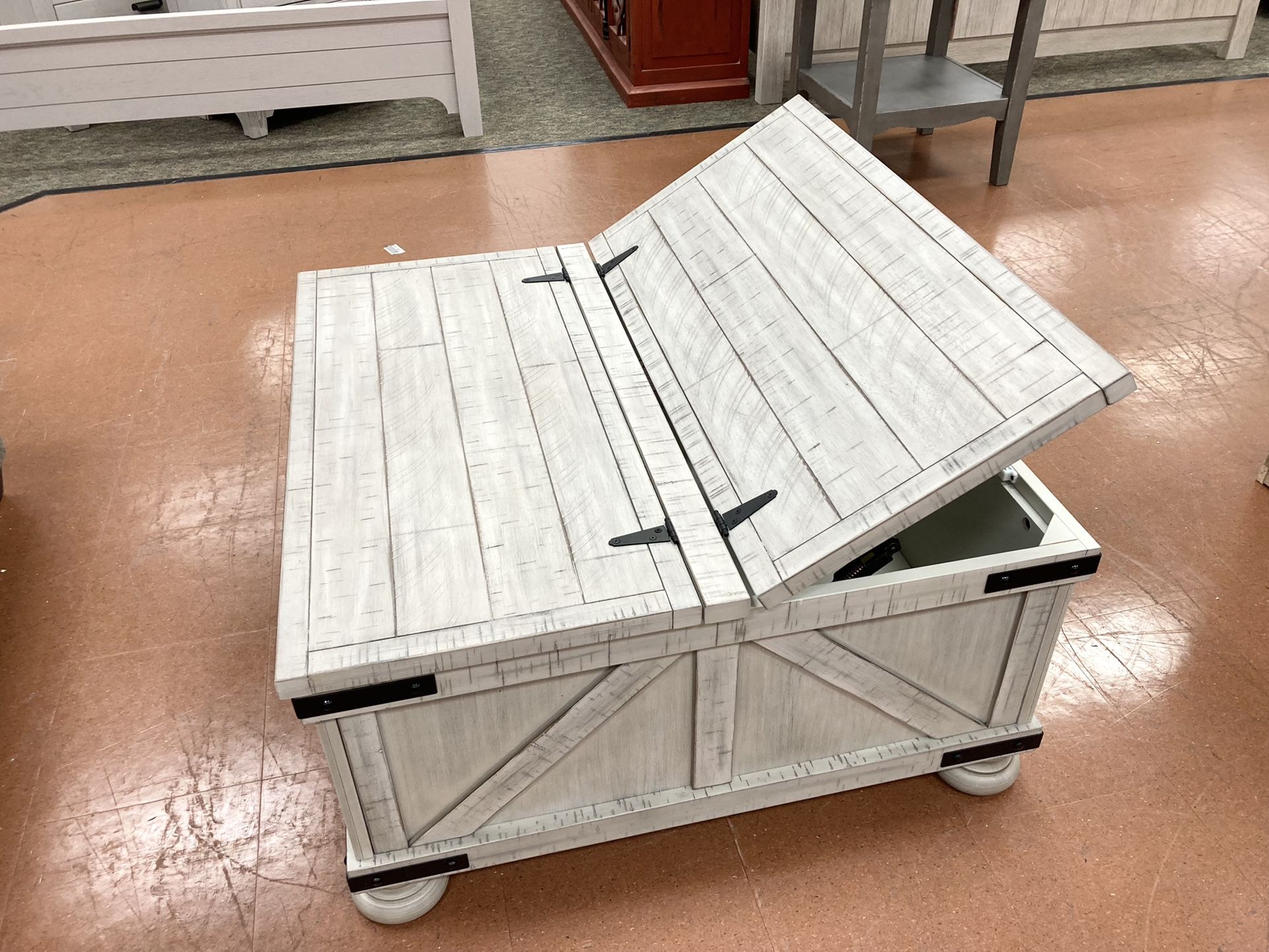 New Storage Coffee Table - $399 Versatile Grey Finish In Stock - Take it Home! Rock’s Carolina Furniture 2356 Virginia Beach Blvd Virginia Beach, VA 23454 (next to TJ Maxx @ London Bridge) Open 10 to 7 Monday - Saturday Open 10 to 5 Sunday