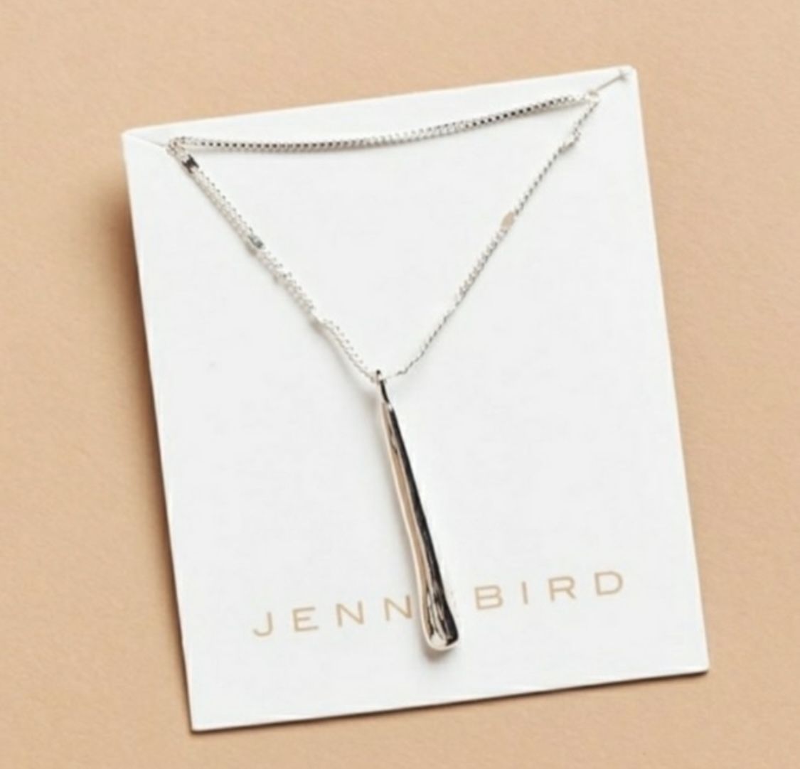A slender, hand formed drop delicately hangs on a purposely stamped, high polish curb chain, layered with a box chain. mix of steel and brass with silver dipped plating finish: high polish lobster clasp closure box chain stamped curb chain product measurements total wearable length: 17"- 19.5" short chain length: 17" long chain length: 19" pendant length: 1.5" / 3.8cm weight: 0.32oz / 9g Imported BRAND NEW NEVER USED