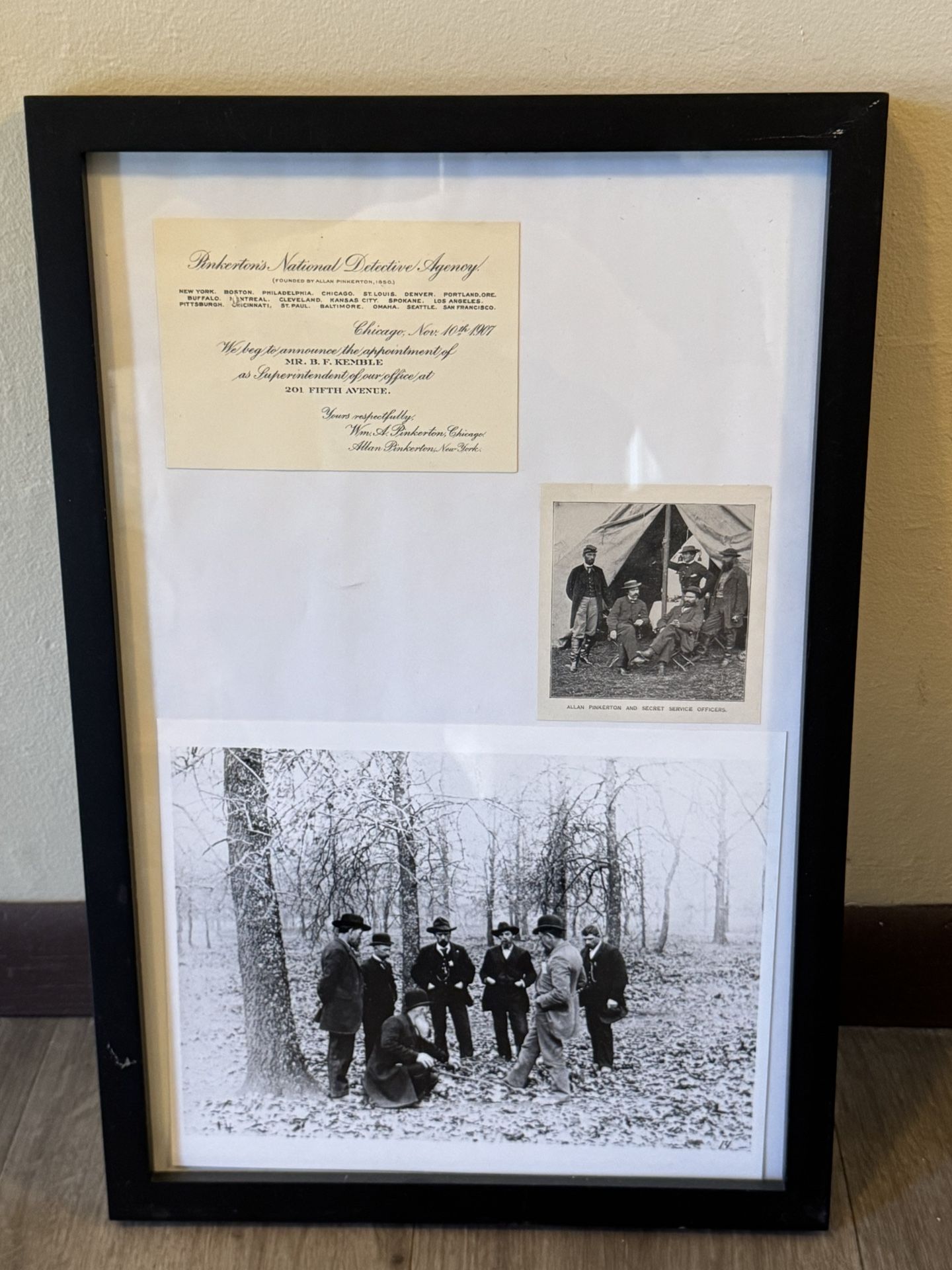 Framed collection of historical photos. Features images of Allan Pinkerton and Secret Service officers. Includes a Pinkerton National Detective Agency announcement letter. Black and white photos. Matted and framed. Hight 1ft 7inch Width 1 ft
