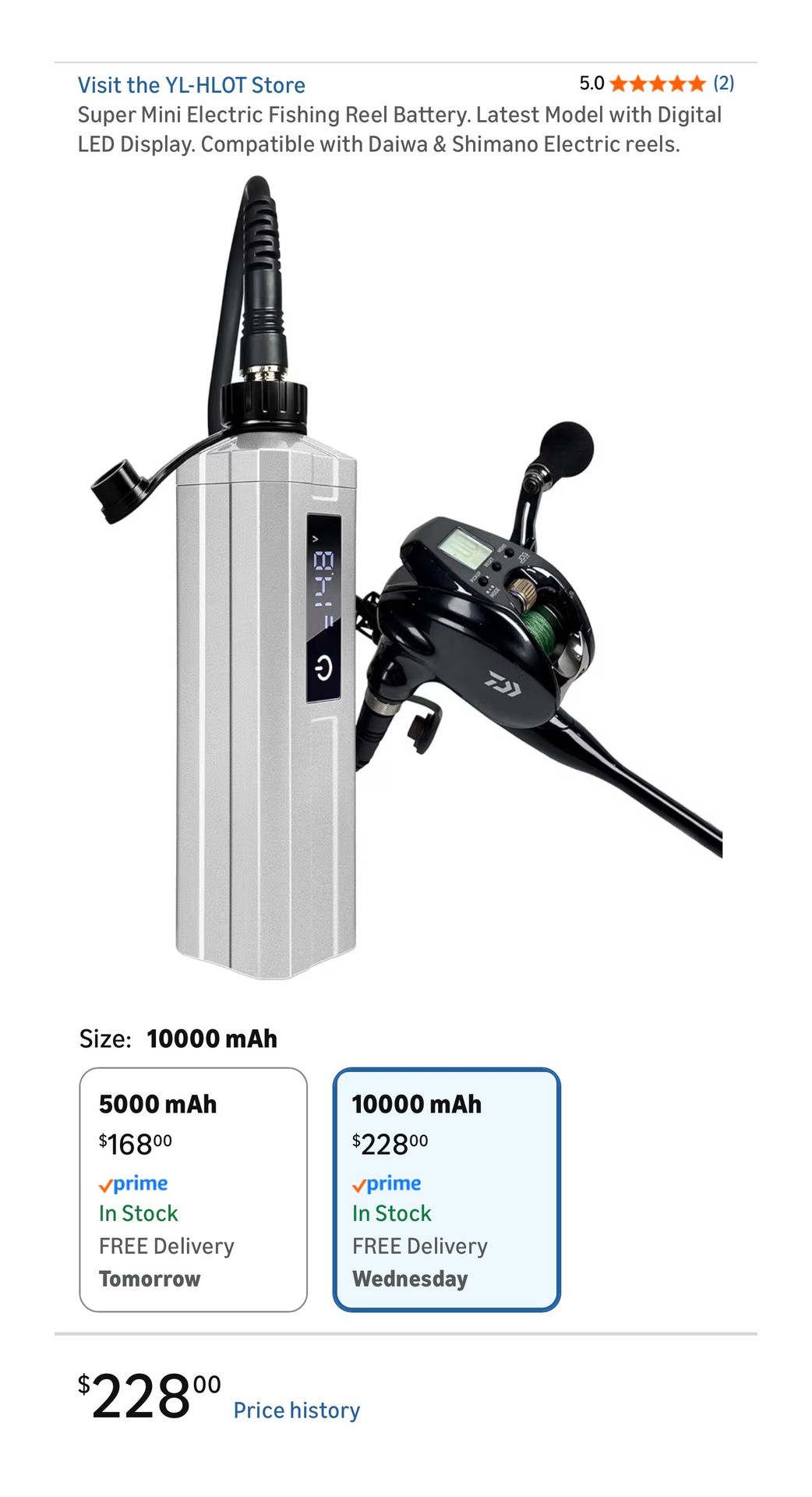 I am selling a brand-new, still-in-the-box, silver 10,000 mAh super mini electric battery-powered fishing reel with an LED display. This is selling on Amazon for $228, plus tax, totaling $253. I am pricing this to sell. About this item: *Hand orientation: Ambidextrous *Material: Acrylonitrile Butadiene Styrene (ABS) *Item weight: 1.5 Pounds *Portability: Upgraded electric reel battery. Rated voltage: 14.8V 10,000 mAh. Dimensions: 7.48 inches * 1.9 inches * 1.9 inches. Weight: 1.48 pounds. Includes 4.9 ft. electric reel power cord for easy portability. *Function: The latest independent digital display LED screen, voltage, power display, temperature-free switching. The device status is clear at a glance. *Rust-proof design: Electric reel battery features a high-strength ABS casing. It's saltwater-resistant and provides more stable power in a more compact package. It easily attaches to your electric reel. Chip: The electric fishing reel battery uses a professional chip. Built-in multiple protection systems: overcharge, over discharge, short circuit, overvoltage, overheating.