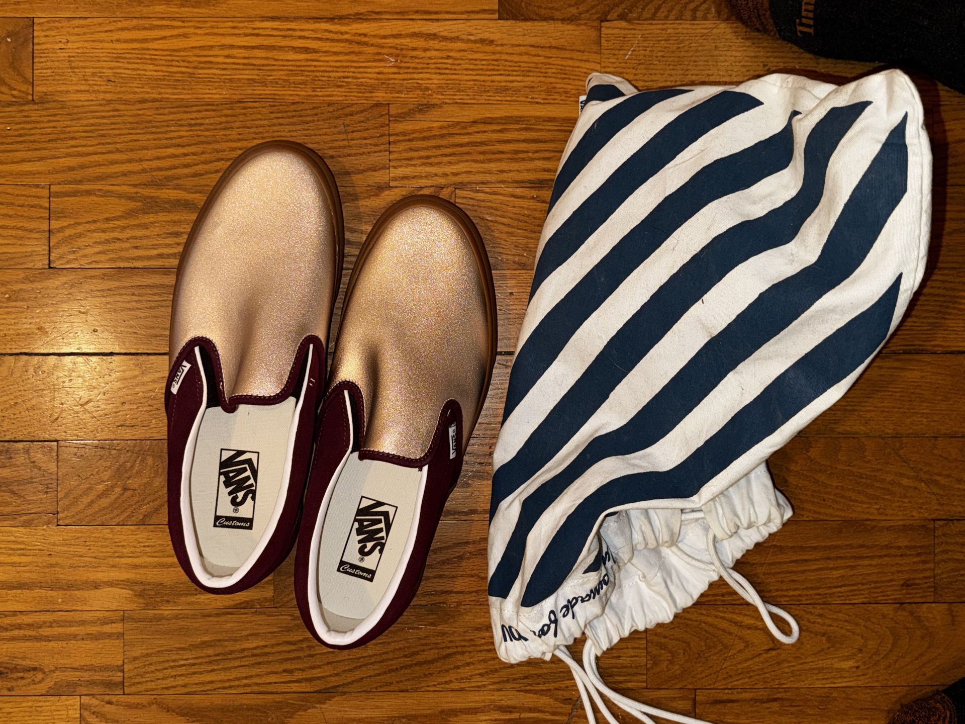 Size 10 Custom vans never worn before Maroon colored heel with glittery pink toe Comes with bag pictured Make an offer