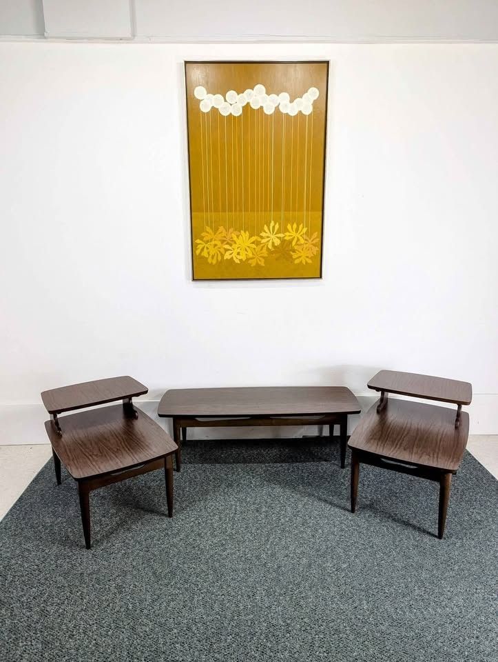 Great set of MCM living room tables. They feature solid walnut framing with stress free laminate tops so you can ditch the coasters!