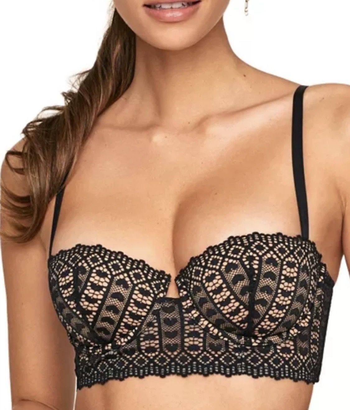Adore Me black lace balconette bra. Features a sheer mesh band and adjustable straps. Lace overlay provides intricate detail. This elegant black lace bralette offers a perfect blend of comfort and style. Ideal for everyday wear, it features intricate lace detailing for a sophisticated look. New without tags.Never worn.