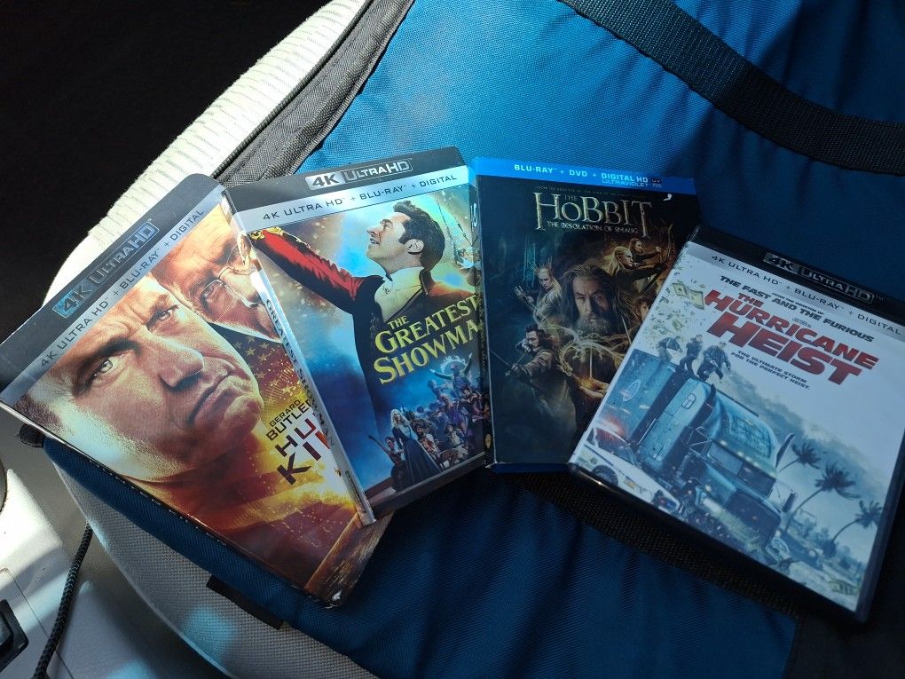 All like new, 1 bluray hobbit , 3 ultra HD 4l vids with Blu-ray backup. Hunter killer 4k, greatest showman 4k, Smaug Hobbit Blu-ray, Hurricane Heist 4k