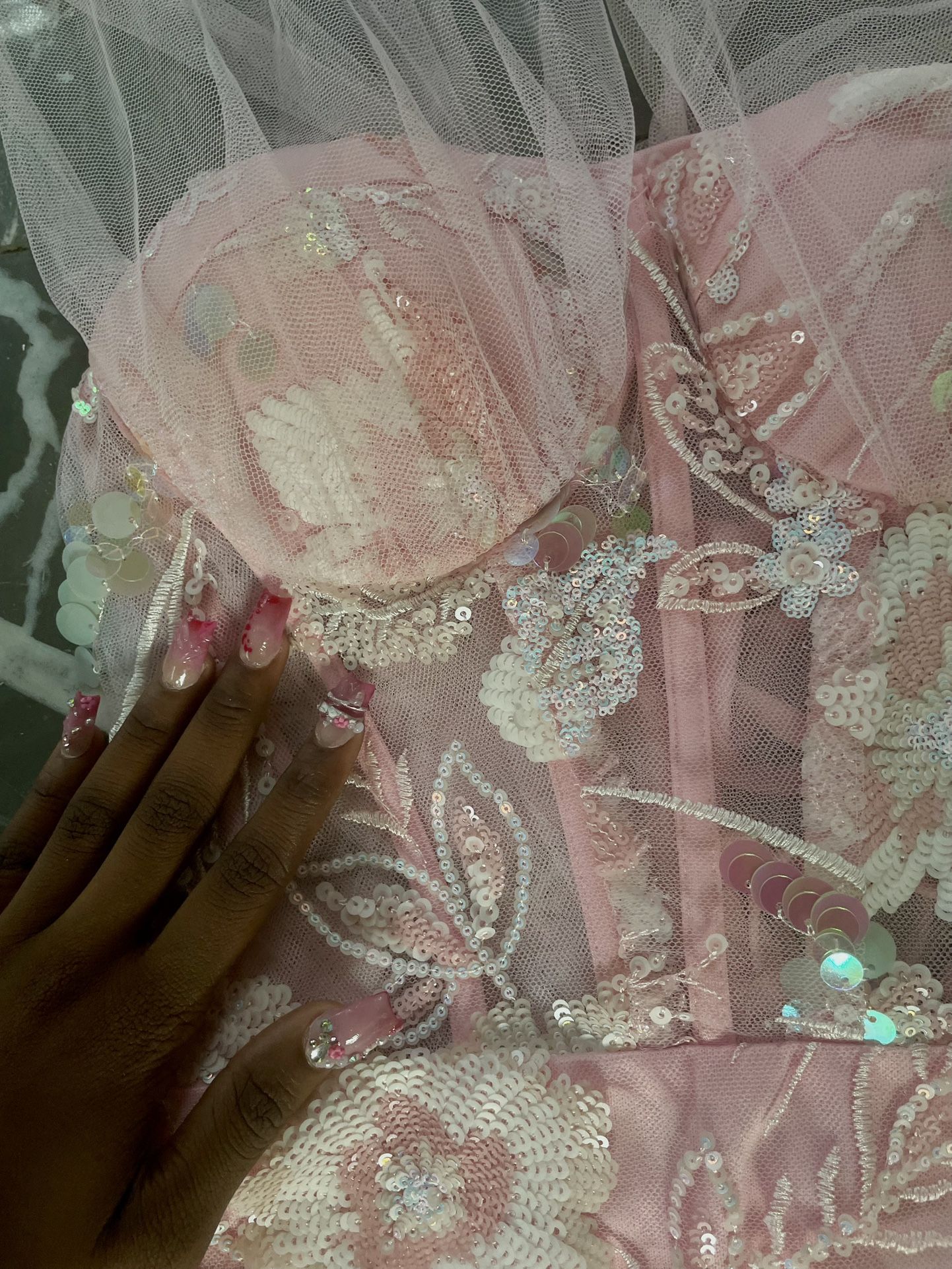 blush pink mermaid style dress with floral lace detailing, subtle sparkles, and a layered tulle bottom! Worn only one time. I am the model in the photo i am 5’2 and 103 pounds the dress is a xs