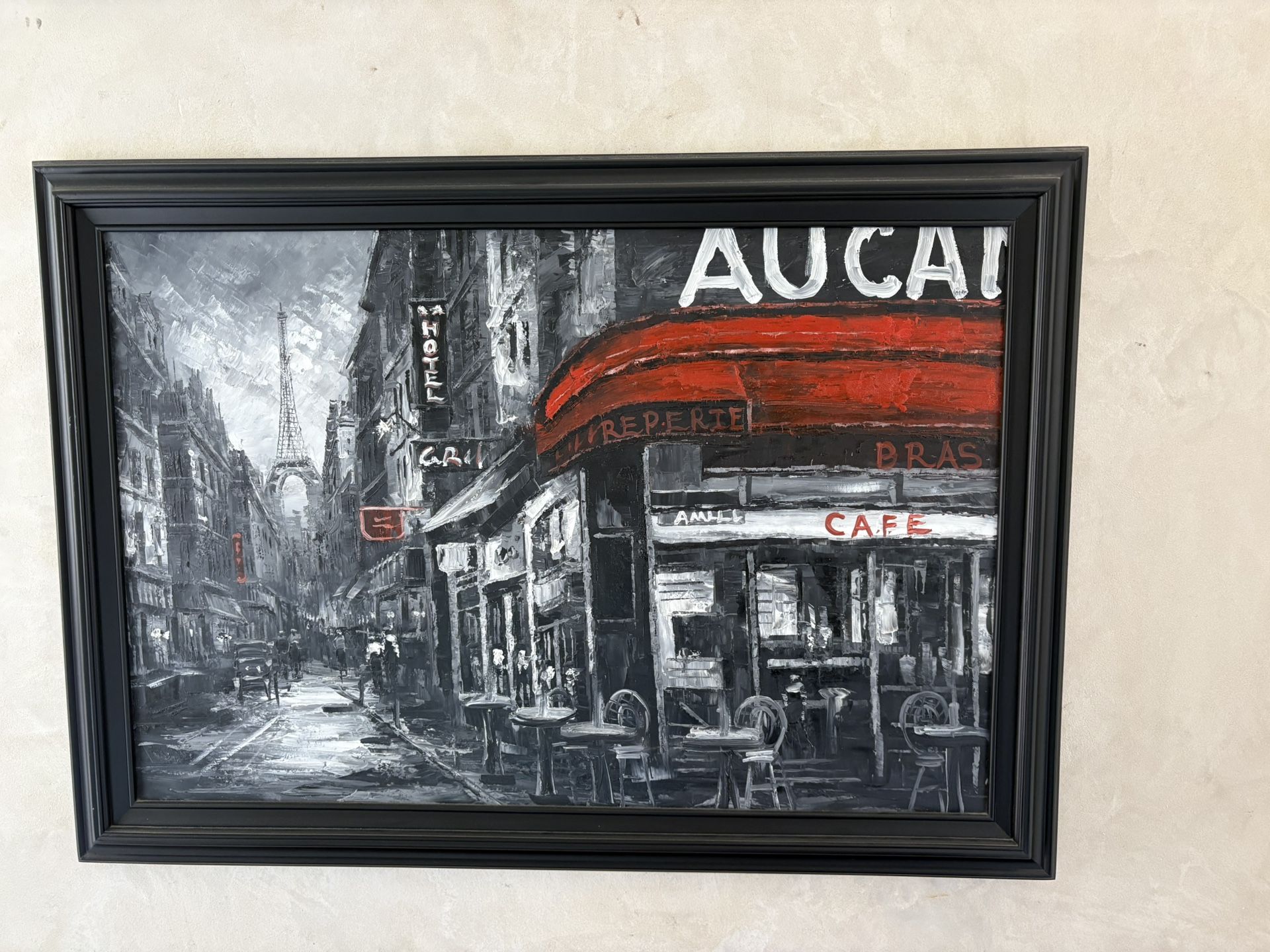 This item is a framed hand-painted oil painting entitled "Au Cafe at Night," featuring a black and white Parisian street scene with red accents on the cafe awning. Subject: Parisian cafe scene with the Eiffel Tower in the background. Style: Impressionistic cityscape painting. Color Palette: Primarily black, white, and gray with prominent red highlights. Features: Hand-painted oil on canvas typically housed in a black frame. 41 1/2 x 29 1/4