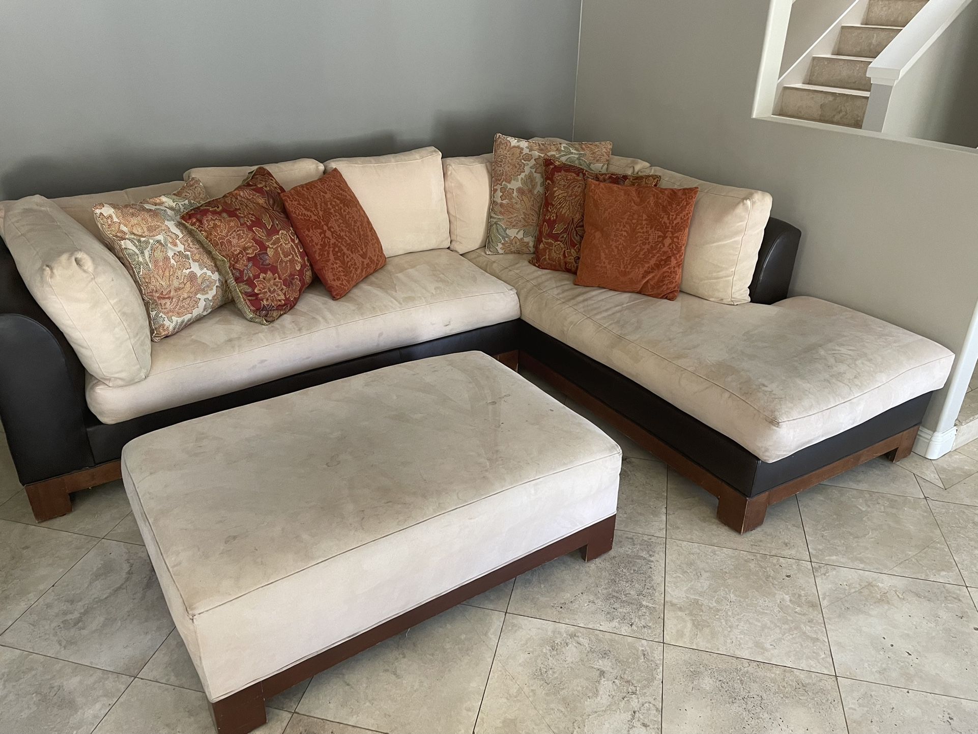 Couch is cream color with dark brown leather at bottom . Comes with ottoman and throw pillows. Needs a deep clean . PICK UP ONLY AND YOU MUST MOVE IT OUT THE HOUSE YOURSELF . located in pacific beach . 300$ OBO