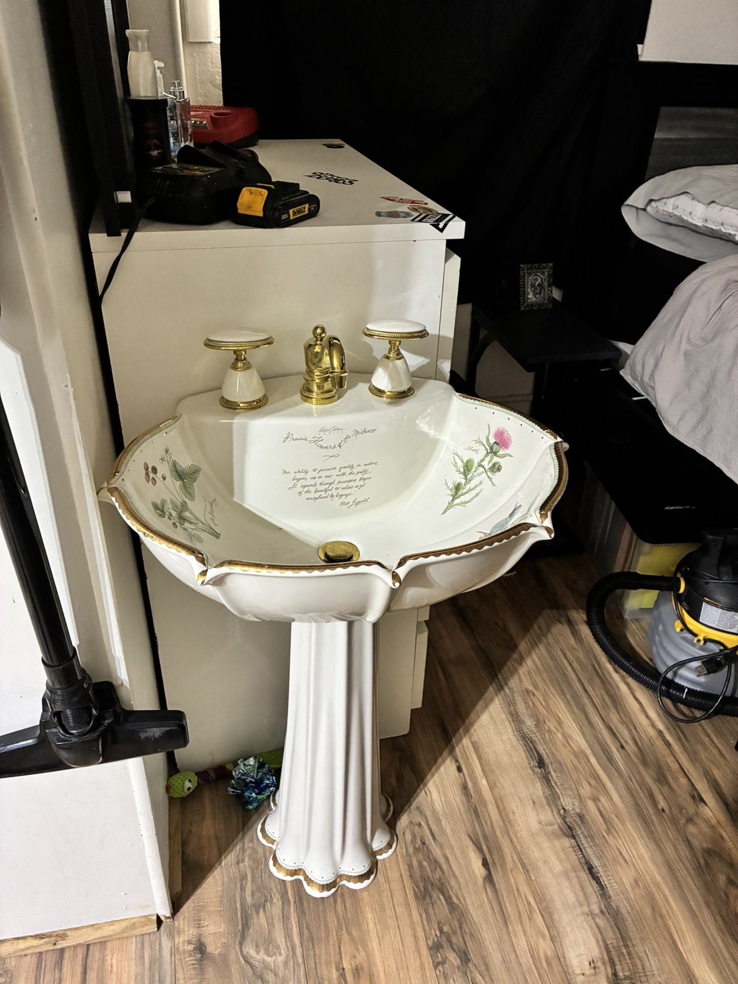 With prairie flowers design, discontinued. Original msrp without faucet $1932.49. Pedestal , sink and faucet all in great working condition