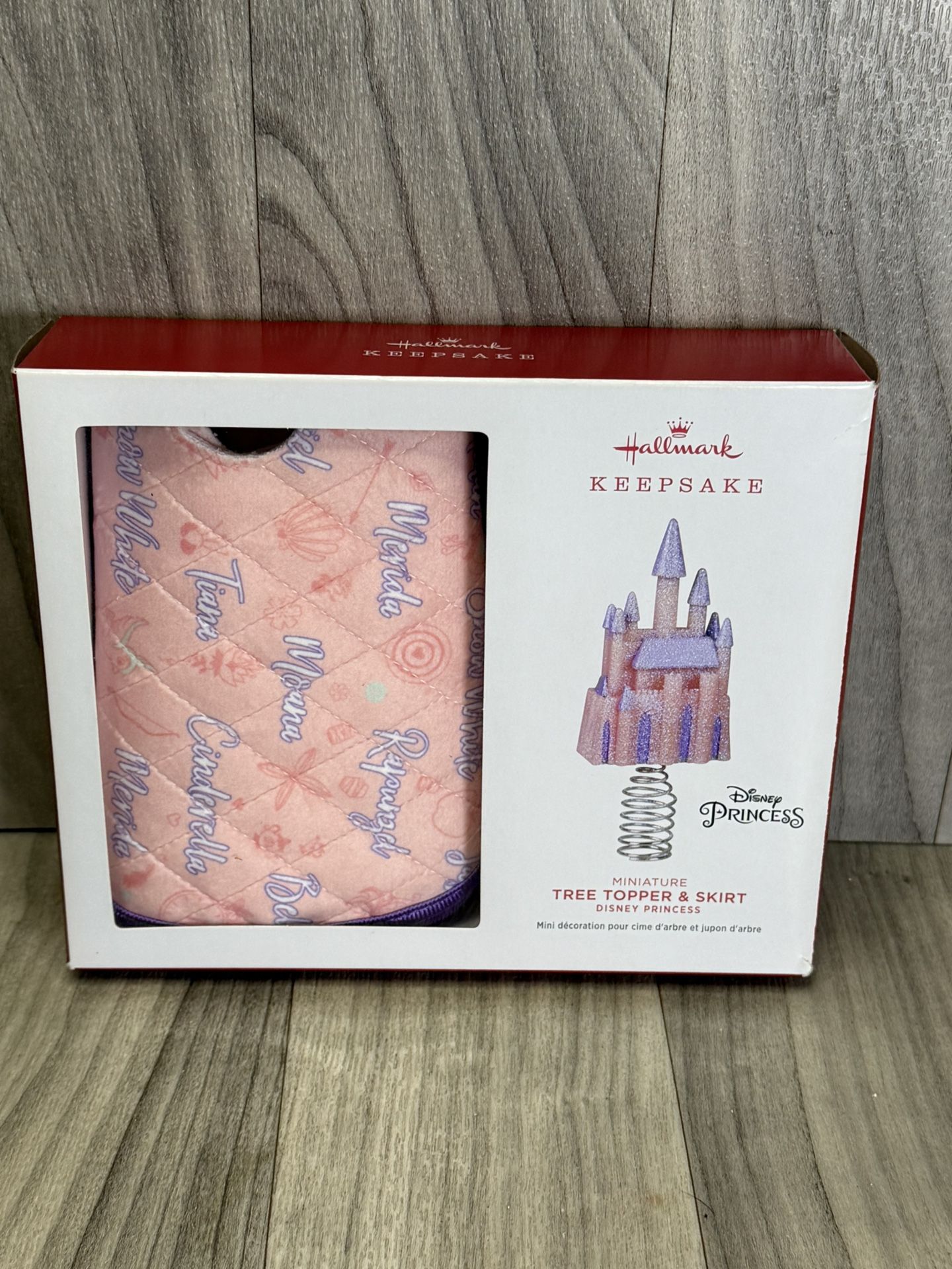 Get ready for the cutest holiday decorating with this Hallmark Keepsake Mini Christmas Tree set! This adorable 2-piece package includes a shimmering, glittery Disney Princess Castle Tree Topper designed for smaller tabletop trees, along with a matching mini quilted tree skirt. The pink, quilted skirt features the names of classic Disney Princesses (like Ariel, Belle, Tiana, and more) woven throughout the pattern. It's the perfect way to add a touch of Disney magic to your apartment, office desk, or child's room! A must-have for any Disney Princess collector or anyone setting up a small, themed Christmas tree. Check out our they listings for great things with great prices! #(342)