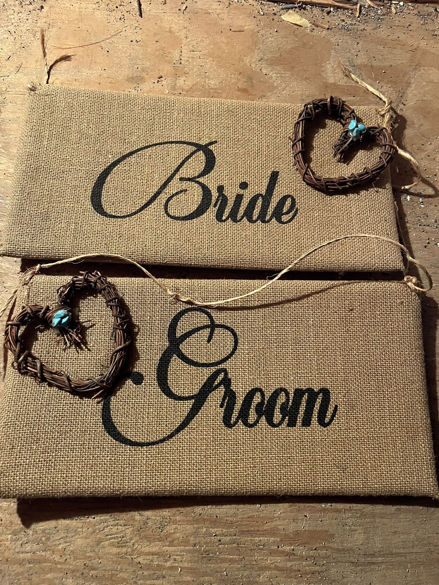Bride and groom hanging signs. We used for the back of our chairs but could be hung anywhere. Save the date cards have never been opened. Mpu Lee Trevino and vista del sol