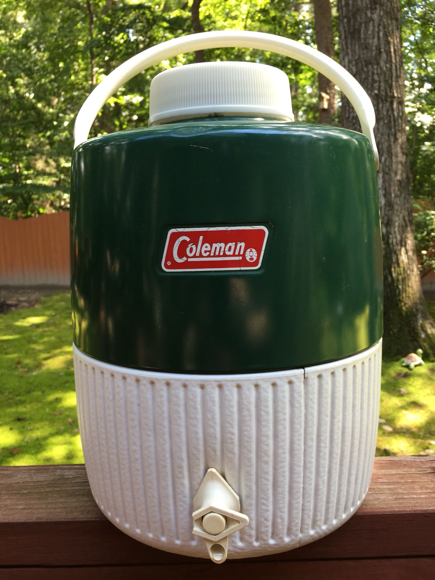 2 gallon personal size water jug by Coleman. Metal upper exterior will hold ice and water for a long time. 1970’s era jug in excellent shape and very clean inside and out. Been stored away...camping days are over. They aren’t made like this anymore.