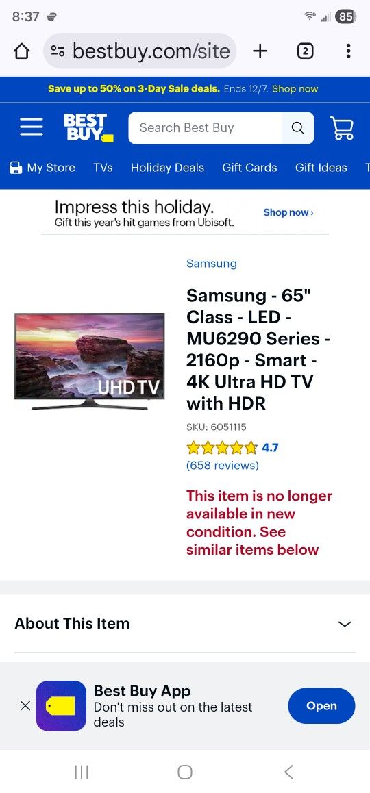 65 Inch HD Samsung Smart TV Fully functional Works fine I just purchased another TV ---------------------------------------------- TV is removed from the mount and ready for pickup. FYI - TV Mount is also for sale on a separate post listed as "Ceiling Mount"