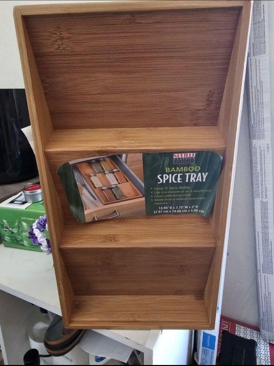 Selling 2 Seville Classics 3-Tier Bamboo Wood Spice Rack Cabinet Drawer Tray Organizer for $30.00 or most reasonable offer. Set of 2 drawer organizers These are new, never used, however there are a few light scuffs on them.