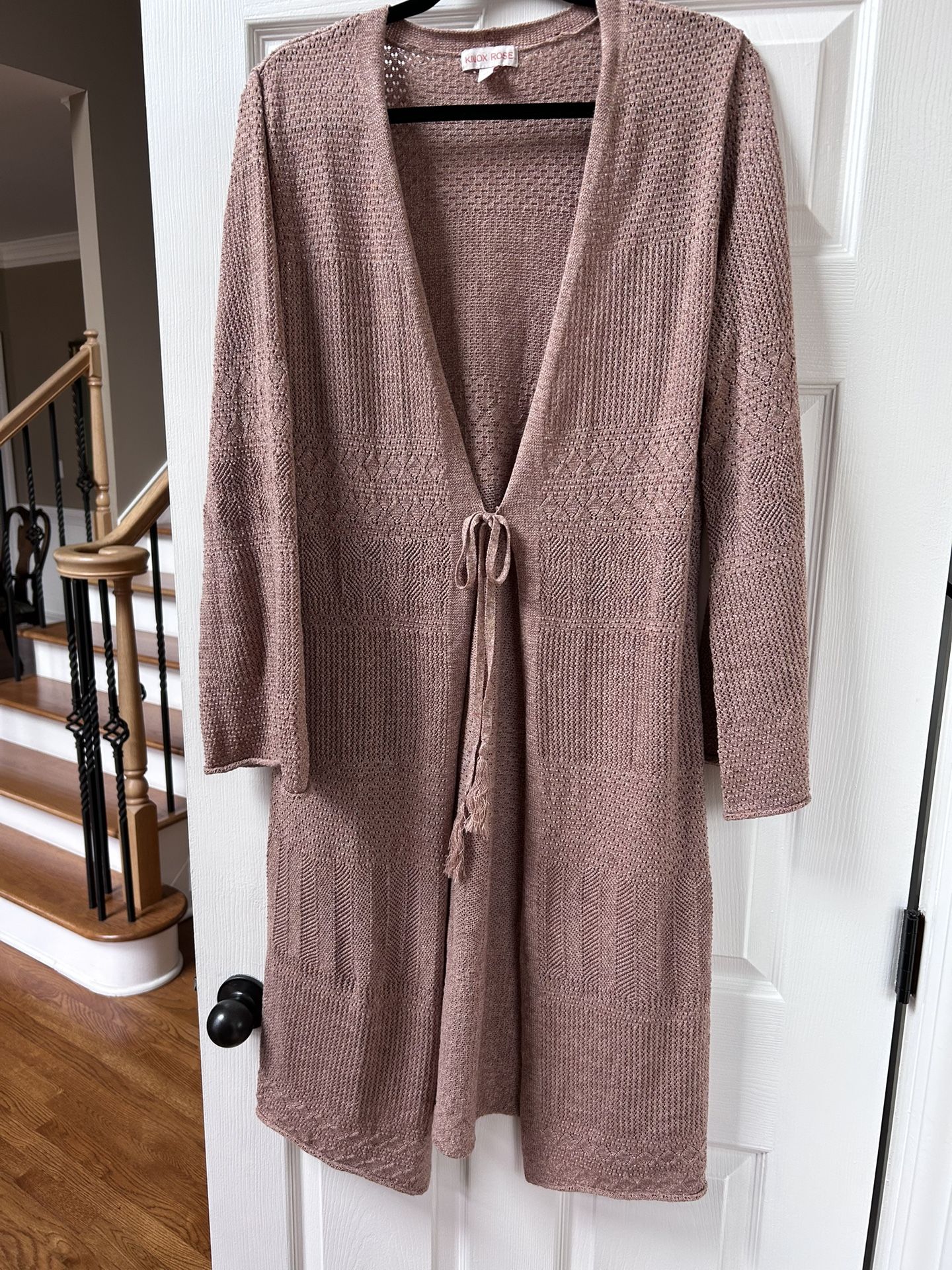 ‘Knox Rose’ open front calf length sweater, size large - tan/light coral- -$12 PRICE REDUCED TO $8 Pick up near Sandy Plains and Wigley Rds Marietta 30066 Cash or Venmo