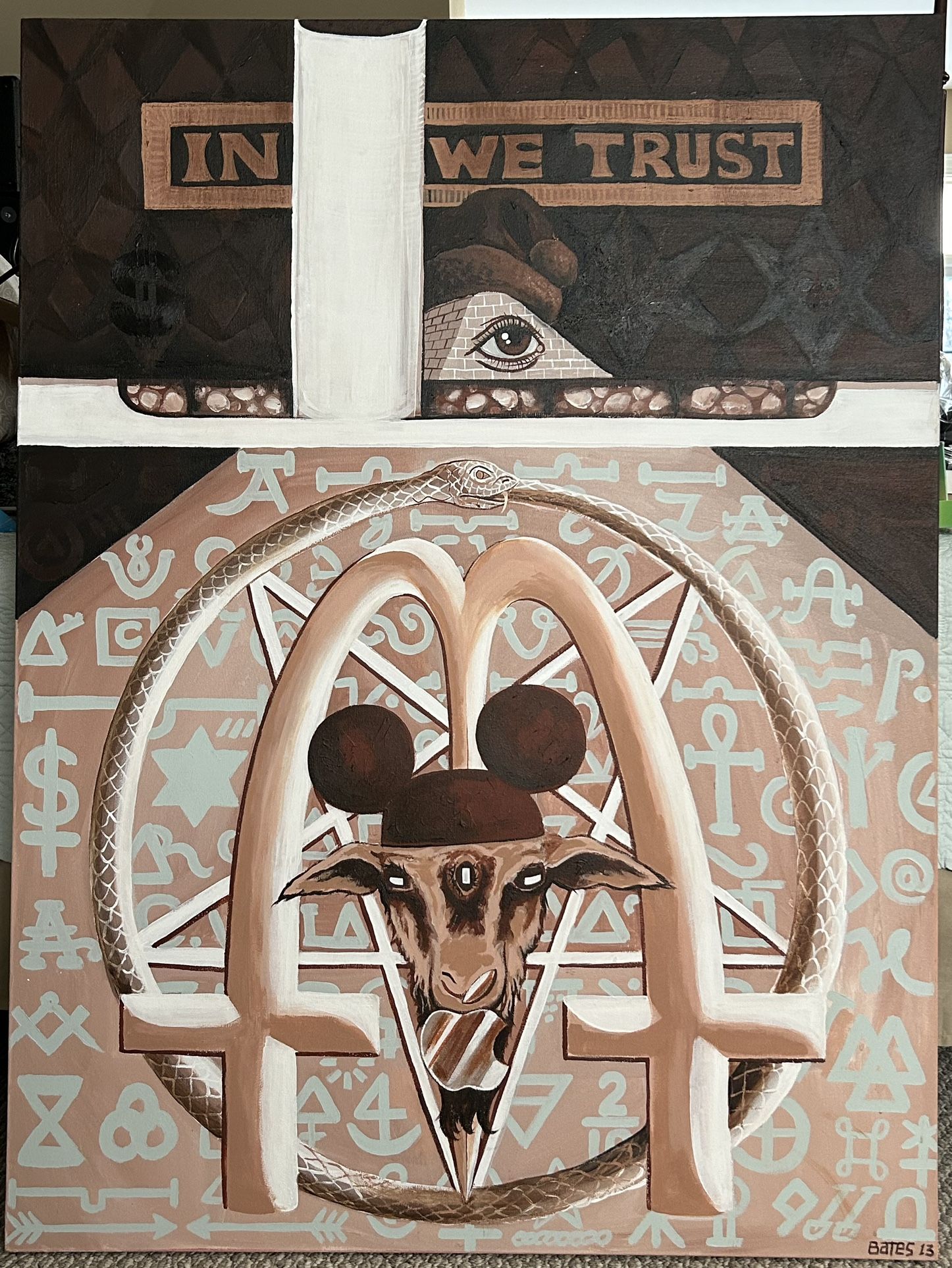 This is a canvas painting by a local artist Measures 36”(3 ft) X 48”(4ft) Depicting World Corruption and addictions Local pickup and cash only