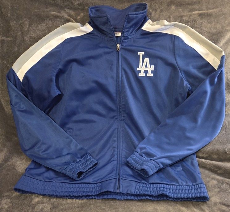 Gently Used Women's Los Angeles Dodgers full zip women's jacket size Large. Has 2 front pockets, sparkly front and back logos, fleece interior lining. Great condition, hardly used.
