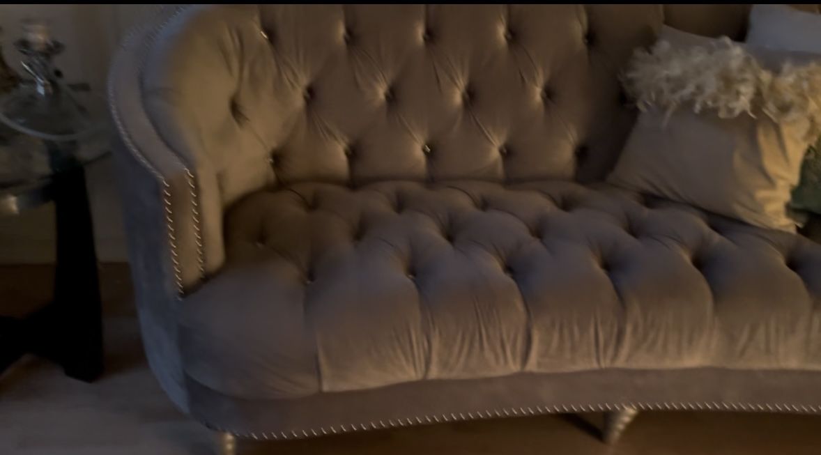 This set is suede like material, has faux rhinestone that are all over, slightly used, has been cleaned, very comfortable, legs come off with no issues. Pillows are not for saleMUST BE ABLE TO PICK UP