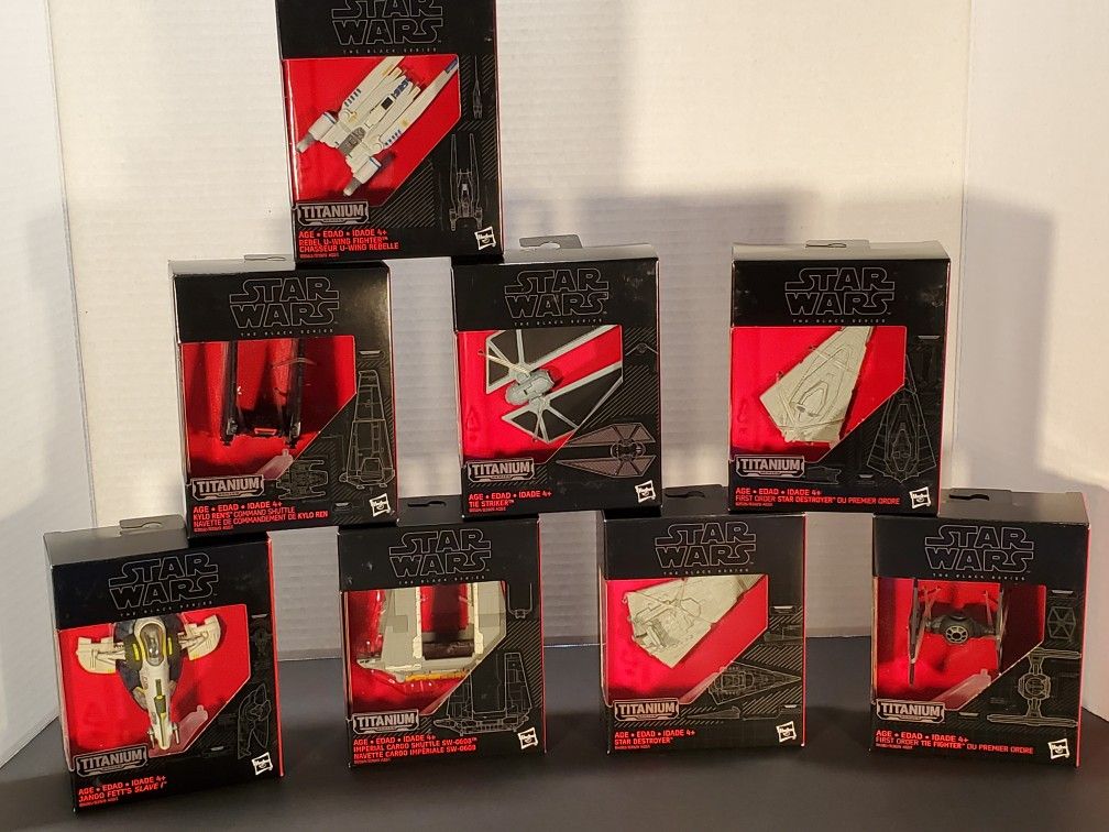 I have the following STAR WARS Black Series-Titanium Series Helmut's and Star Ships for sale; HELMUTS: #01-Kylo Ren & Poe Dameron. #02 - Captain Phasma & First Order Storm Trooper. #03 - Darth Vader & Storm Trooper. #05 - Finn (FN-2187) & First Order Tie Fighter Pilot. #06 - Imperial Death Trooper & Rebel Commando, (2 available). SHIPS: #03 - Kylo Ren's Command Shuttle. #06 - First Order Star Destroyer. #13 - First Order Tie Fighter. #24 - Star Destroyer. #27 - Jango Fett's Slave I. #29 - Rebel U-Wing Fighter. #30 - The Striker. #31 - Imperial Cargo Shuttle SW-0608. The collectibles are all brand new in the box. Asking $ 140.00, ($10 each) obo. Contact me for details about my location to see/purchase these items! Daniel