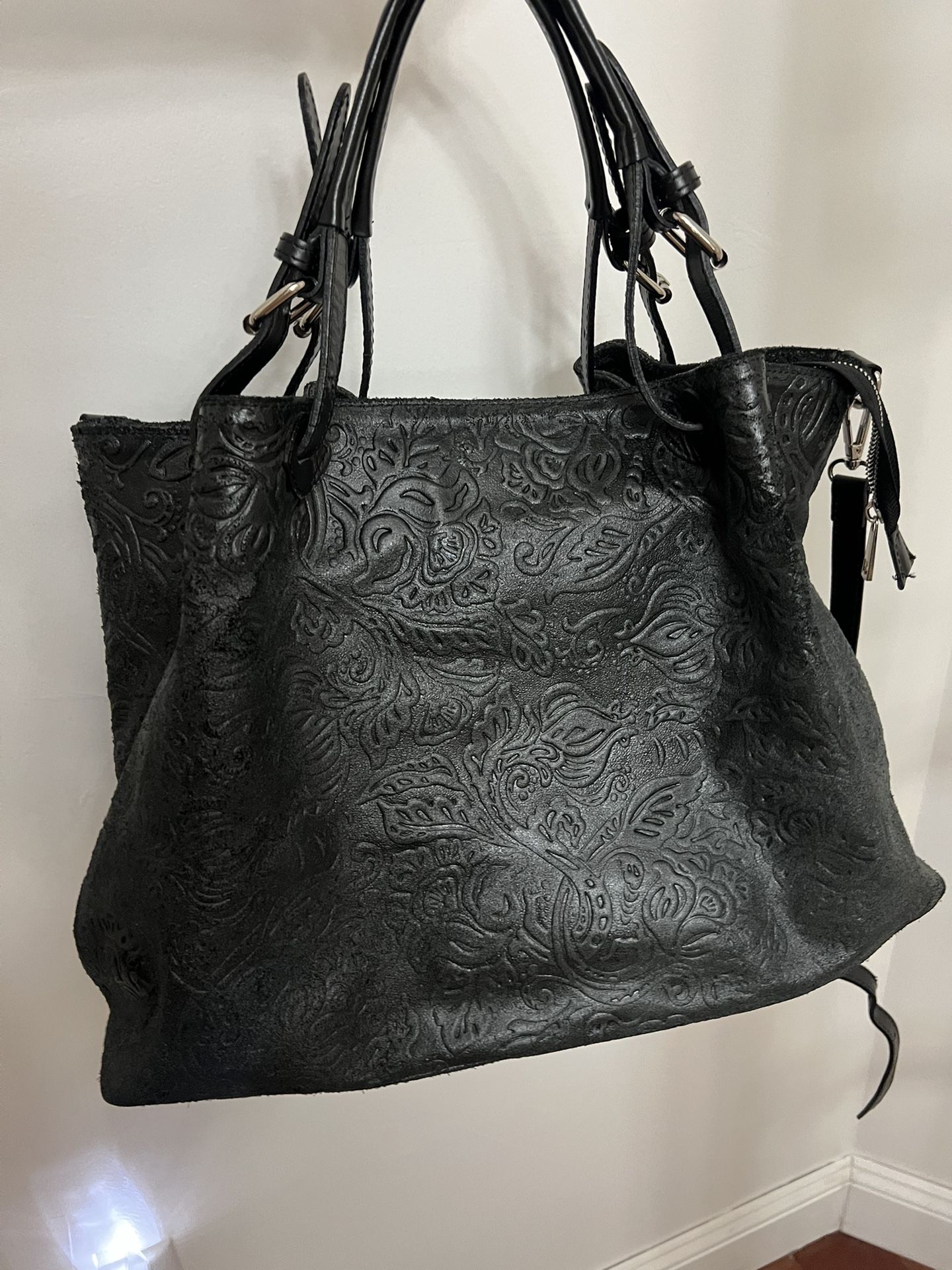 ISADORA ITALY TOOLED LEATHER PURSE BLK LARGE TOTE MSRP $425