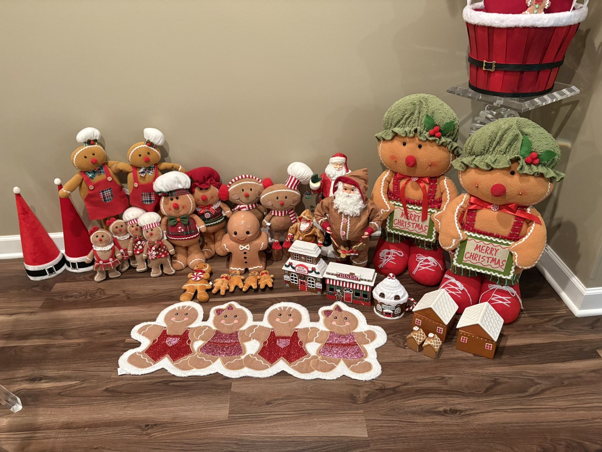 I have a lot of gingerbread stuff willing to sell for 300 not a dollar less please no low offers I will not reply everything’s in new condition. Still got time for the holiday. And some Santa hats and Santa Claus that tells stories needs batteries.