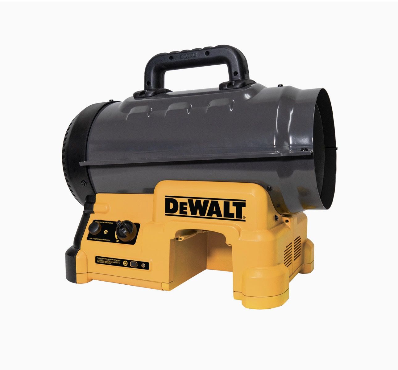 Open box DeWalt's NEW Cordless 70,000 BTU Forced Air Propane Heater. With it's corded or cordless design, this heater is the ultimate solution for efficient, portable warmth in any workspace. DXH70CFAVX offers big heat capable of heating spaces of up to 1,750 square feet. The Quiet Burner Technology minimizes noise levels without compromising on performance, creating a warm and quiet environment conducive to productivity. Experience the future of portable heating with DeWalt's Cordless Forced Air Propane Heater.