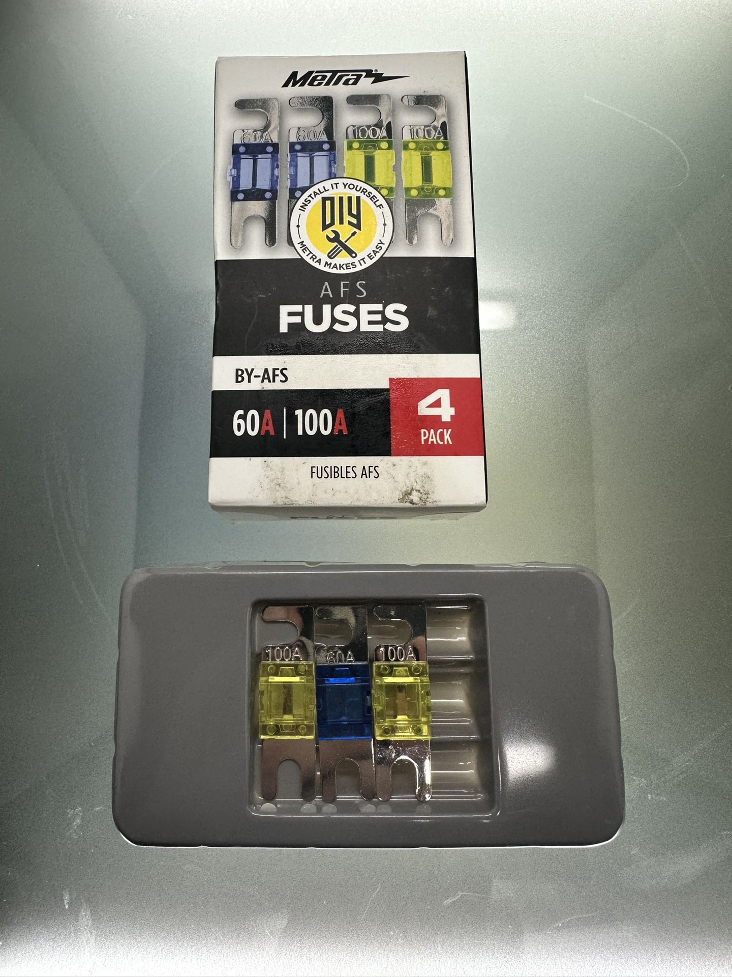 New open box only one fuse missing — The Metra AFS fuses come in a convenient 3 pack, with one 60amp fuse and two 100amp fuses. These fuses are designed for use in automotive and truck applications, providing a reliable and efficient connection for electrical circuits. The Metra brand is known for its quality and durability, making these fuses a trusted choice for maintaining the electrical system in your vehicle.