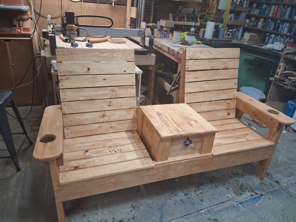 Quality built with comfort in mind . Very comfortable and sturdy . Has center storage with a bottle opener and cup holders in the arms .