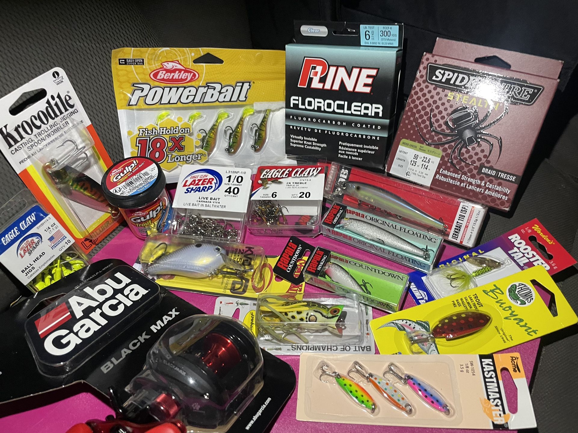 fishing gear lot 85$ takes all abu garcia fishing reel fishing lures, baits, fishing line, fishing hooks etc brand new everything in picture check out my 65$ lot for more gear without thereel thnxx