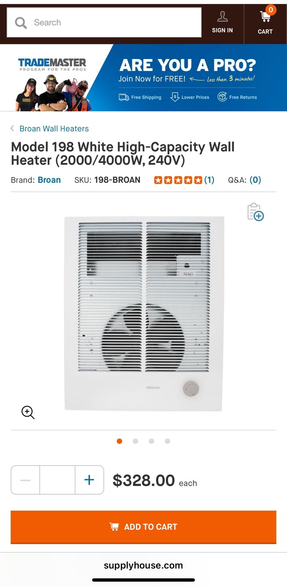 Brand New Broan Wall Heater with Built-In Thermostat, 4000W Model: 198