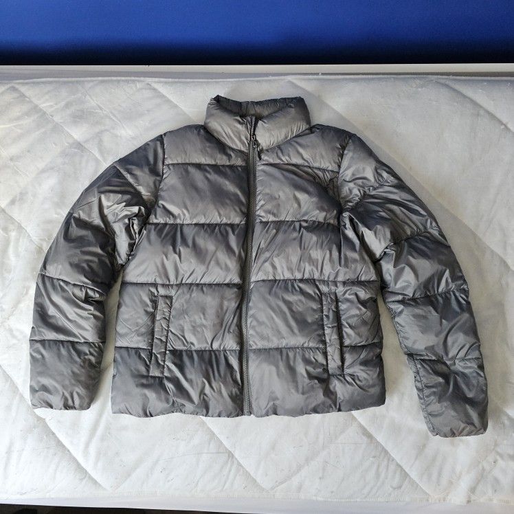 This is a women's 32 Degrees puffer lightweight jacket in size medium, featuring a grey nylon outer shell. The jacket is designed to provide warmth and style, making it a versatile addition to any wardrobe. With its comfortable fit and sleek design, this jacket is perfect for staying cozy during colder weather while still looking fashionable.