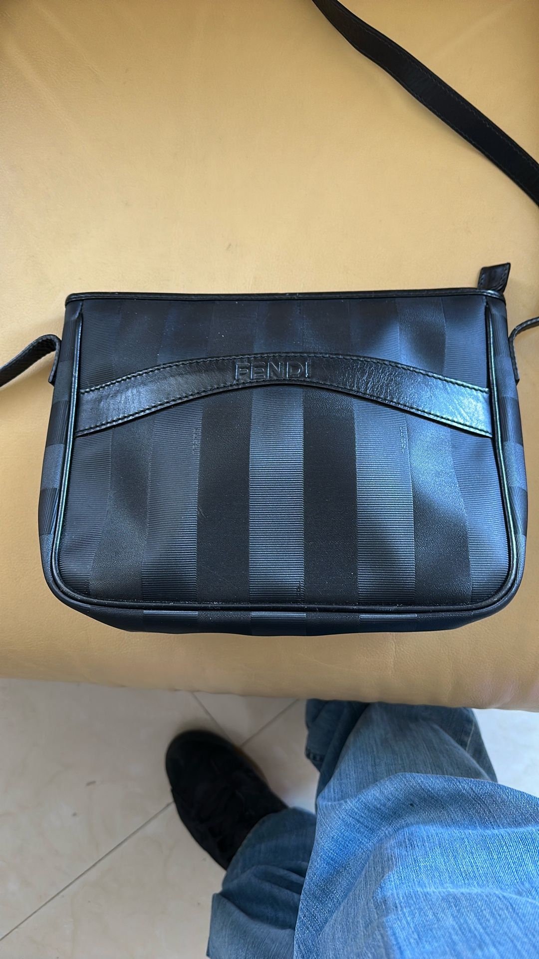 For sale one used Fendi pocketbook made in Italy 100% guaranteed authentic bag is barely used. Excellent condition has leather liner on the inside has strap for shoulder zipper pocket inside and zipper on outside. Black color strap is adjustable.
