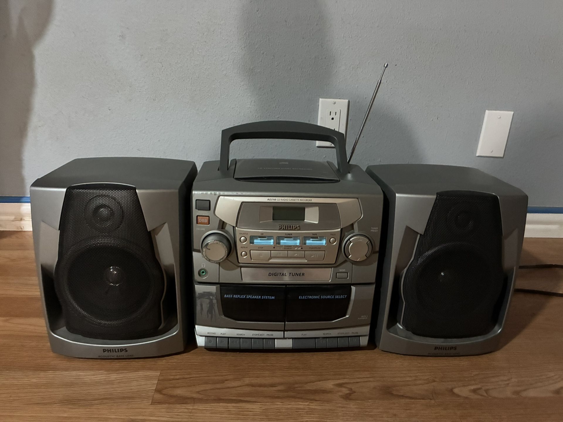 Philips, radio, CD player, and dual cassette. The cd player, radio, and speakers work great. The cassette players needs belt replacements. The speakers are detachable. Asking $40